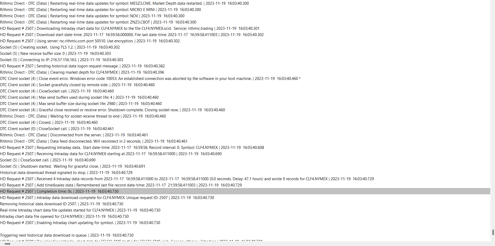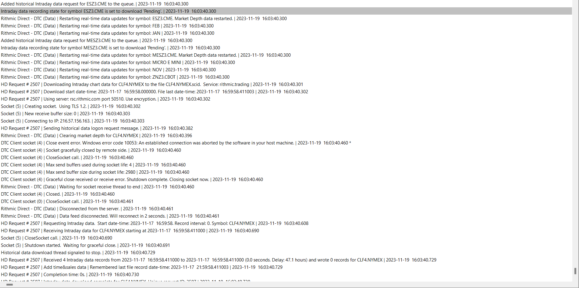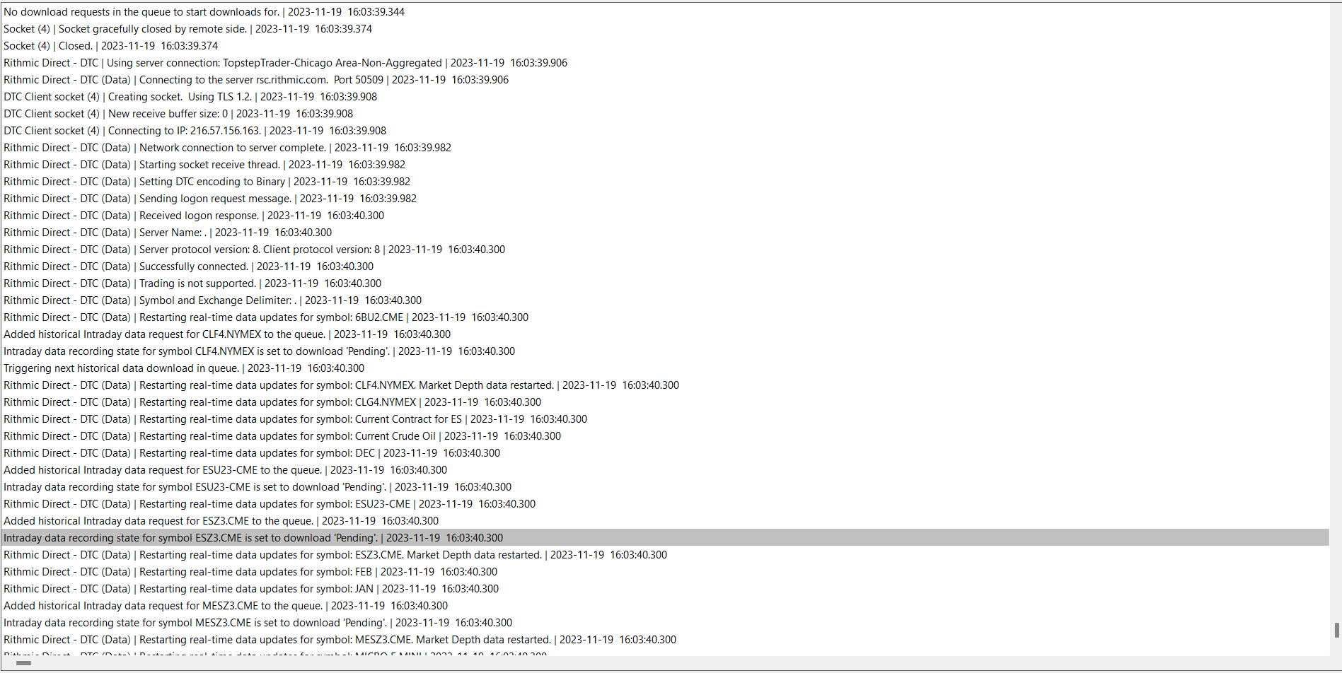 The status bar is green to indicate a connection but it keeps downloading data, then it says download complete, then it says waiting to download historical data again, then it says downloading historical data again, then it says download complete over and over again very quickly. The charts are loaded but not ticking and it keeps doing this. In the message log, I notice it says, "rithmic direct - dtc (data) trading is not supported" Is my data set up properly? I have SP11 enabled, which I have been using soley for the past few months to trade with topstep. Also, I tried deleting and redownloading data as well as Global settings > symbol settings > update from server and unchecking "use custom symbol setting values." Software version: 2564 64-bit | 2023-11-20 22:23:04.637 Primary Thread ID: 6660 | 2023-11-20 22:23:04.637 Usage end date: 2023-12-15 | 2023-11-20 22:23:04.637 Enabled for: Advanced Features 2. | 2023-11-20 22:23:04.637 Enabled for: Sierra Chart Historical Data Service. | 2023-11-20 22:23:04.637 Enabled for: Denali Real-Time Exchange Data Feed. | 2023-11-20 22:23:04.637 Enabled for: Delayed Denali Exchange Data Feed. | 2023-11-20 22:23:04.637 Allow Support for Sierra Chart Data Feeds is enabled. | 2023-11-20 22:23:04.637 Current selected Data/Trading service: Rithmic Direct - DTC | 2023-11-20 22:23:04.637 Custom symbol settings values: enabled | 2023-11-20 22:23:04.637 Chart Update Interval: 500 | 2023-11-20 22:23:04.637 Intraday Data Storage Time Unit: 0 | 2023-11-20 22:23:04.637 Time Zone: -05:00:00 (EST-05EDT+01,M3.2.0/02:00,M11.1.0/02:00) | 2023-11-20 22:23:04.637 2023-11-21 03:23:04 Local computer time in UTC | 2023-11-20 22:23:04.637 2023-11-20 22:23:04 Local computer time in SC Time Zone | 2023-11-20 22:23:04.637 2023-11-21 03:03:31 Server time in UTC | 2023-11-20 22:23:04.637 Local computer UTC time and Server UTC time difference: 0 seconds. | 2023-11-20 22:23:04.637 Program path: C:\SierraChart\ | 2023-11-20 22:23:04.637 Data Files path: C:\SierraChart\Data\ | 2023-11-20 22:23:04.637 OS Version Number: 10.0 | 2023-11-20 22:23:04.638 Locale Setting: C | 2023-11-20 22:23:04.638 DLLs: UserContributedStudies_64.dll | 2023-11-20 22:23:04.639 Allowed protected custom studies: | 2023-11-20 22:23:04.639 Crash reporter started: true | 2023-11-20 22:23:04.639 Rithmic Direct - DTC | Using server connection: TopstepTrader-Chicago Area-Non-Aggregated | 2023-11-20 22:23:11.831 Rithmic Direct - DTC | Connecting to the server rsc.rithmic.com. Port 50508 | 2023-11-20 22:23:11.831 DTC Client socket (1) | Creating socket. Using TLS 1.2. | 2023-11-20 22:23:11.838 DTC Client socket (1) | New receive buffer size: 0 | 2023-11-20 22:23:11.838 DTC Client socket (1) | Connecting to IP: 216.57.156.163. | 2023-11-20 22:23:11.838 Rithmic Direct - DTC | Network connection to server complete. | 2023-11-20 22:23:11.915 Rithmic Direct - DTC | Starting socket receive thread. | 2023-11-20 22:23:11.915 Rithmic Direct - DTC | Setting DTC encoding to Binary | 2023-11-20 22:23:11.916 Rithmic Direct - DTC | Sending logon request message. | 2023-11-20 22:23:11.916 Rithmic Direct - DTC | Received logon response. | 2023-11-20 22:23:12.153 Rithmic Direct - DTC | Server Name: . | 2023-11-20 22:23:12.153 Rithmic Direct - DTC | Server protocol version: 8. Client protocol version: 8 | 2023-11-20 22:23:12.153 Rithmic Direct - DTC | Successfully connected. | 2023-11-20 22:23:12.153 Rithmic Direct - DTC | Trading is supported. | 2023-11-20 22:23:12.153 Rithmic Direct - DTC | Order cancel and replace is supported. | 2023-11-20 22:23:12.153 Rithmic Direct - DTC | OCO Orders supported. | 2023-11-20 22:23:12.153 Rithmic Direct - DTC | Symbol and Exchange Delimiter: . | 2023-11-20 22:23:12.153 Rithmic Direct - DTC | Connected to server complete. | 2023-11-20 22:23:12.153 No download requests in the queue to start downloads for. | 2023-11-20 22:23:12.154 No download requests in the queue to start downloads for. | 2023-11-20 22:23:12.154 No download requests in the queue to start downloads for. | 2023-11-20 22:23:12.154 No download requests in the queue to start downloads for. | 2023-11-20 22:23:12.154 Subscribing to symbol for symbol alert. 6BU2.CME | 2023-11-20 22:23:12.154 Using symbol data fast lookup vector | 2023-11-20 22:23:12.154 Rithmic Direct - DTC | Starting real-time market data updates for: 6BU2.CME. ID: 1 Service code: rithmic.trading | 2023-11-20 22:23:12.155 Rithmic Direct - DTC (Data) | Connecting to the server rsc.rithmic.com. Port 50509 | 2023-11-20 22:23:12.159 DTC Client socket (2) | Creating socket. Using TLS 1.2. | 2023-11-20 22:23:12.161 DTC Client socket (2) | New receive buffer size: 0 | 2023-11-20 22:23:12.161 DTC Client socket (2) | Connecting to IP: 216.57.156.163. | 2023-11-20 22:23:12.161 Rithmic Direct - DTC | Requesting security definition data for: 6BU2.CME. ID: 1 | 2023-11-20 22:23:12.166 Notice: Not connected to Live trading account to receive CME realtime futures data at non-professional fees. | 2023-11-20 22:23:12.166 Rithmic Direct - DTC (Data) | Network connection to server complete. | 2023-11-20 22:23:12.454 Rithmic Direct - DTC (Data) | Starting socket receive thread. | 2023-11-20 22:23:12.454 Rithmic Direct - DTC (Data) | Setting DTC encoding to Binary | 2023-11-20 22:23:12.454 Rithmic Direct - DTC (Data) | Sending logon request message. | 2023-11-20 22:23:12.454 Rithmic Direct - DTC | Starting real-time market data updates for: MESZ3.CME. ID: 2 Service code: rithmic.trading | 2023-11-20 22:23:12.456 Rithmic Direct - DTC | Requesting security definition data for: MESZ3.CME. ID: 2 | 2023-11-20 22:23:12.456 Added historical Intraday data request for MESZ3.CME to the queue. | 2023-11-20 22:23:12.456 Intraday data recording state for symbol MESZ3.CME is set to download 'Pending'. | 2023-11-20 22:23:12.456 Triggering next historical data download in queue. | 2023-11-20 22:23:12.456 Delaying start of download for MESZ3.CME. | 2023-11-20 22:23:12.457 Rithmic Direct - DTC | Starting real-ti
