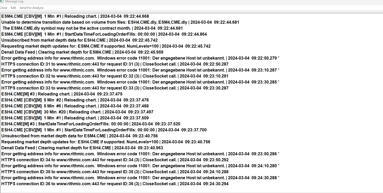 Rithmic is closing the connection: DTC Client socket (2) | Socket gracefully closed by remote side. | 2023-11-19 21:26:03.676 Make sure you are using the correct symbols with Rithmic. Translate them to the current service: Edit Menu: Edit >> Translate Symbols To Current Service Do not use any invalid symbols. This is purely a Rithmic problem. Sierra Chart Support - Engineering Level Your definitive source for support. Other responses are from users. Try to keep your questions brief and to the point. Be aware of support policy: https://www.sierrachart.com/index.php?l=PostingInformation.php#GeneralInformation For the most reliable, advanced, and zero cost futures order routing, use the Teton service: Sierra Chart Teton Futures Order Routing |