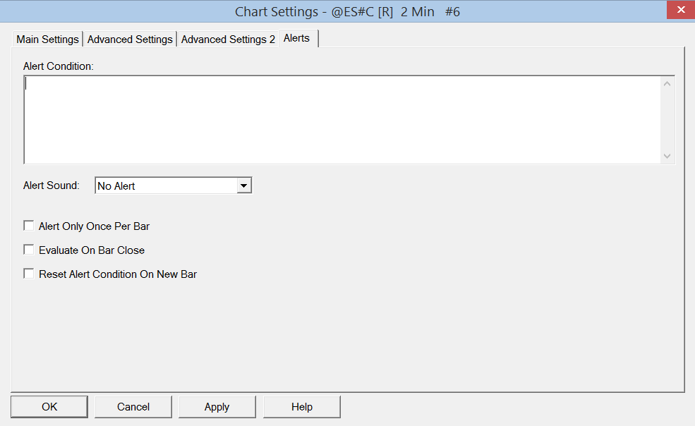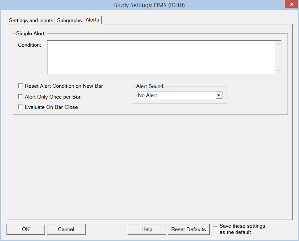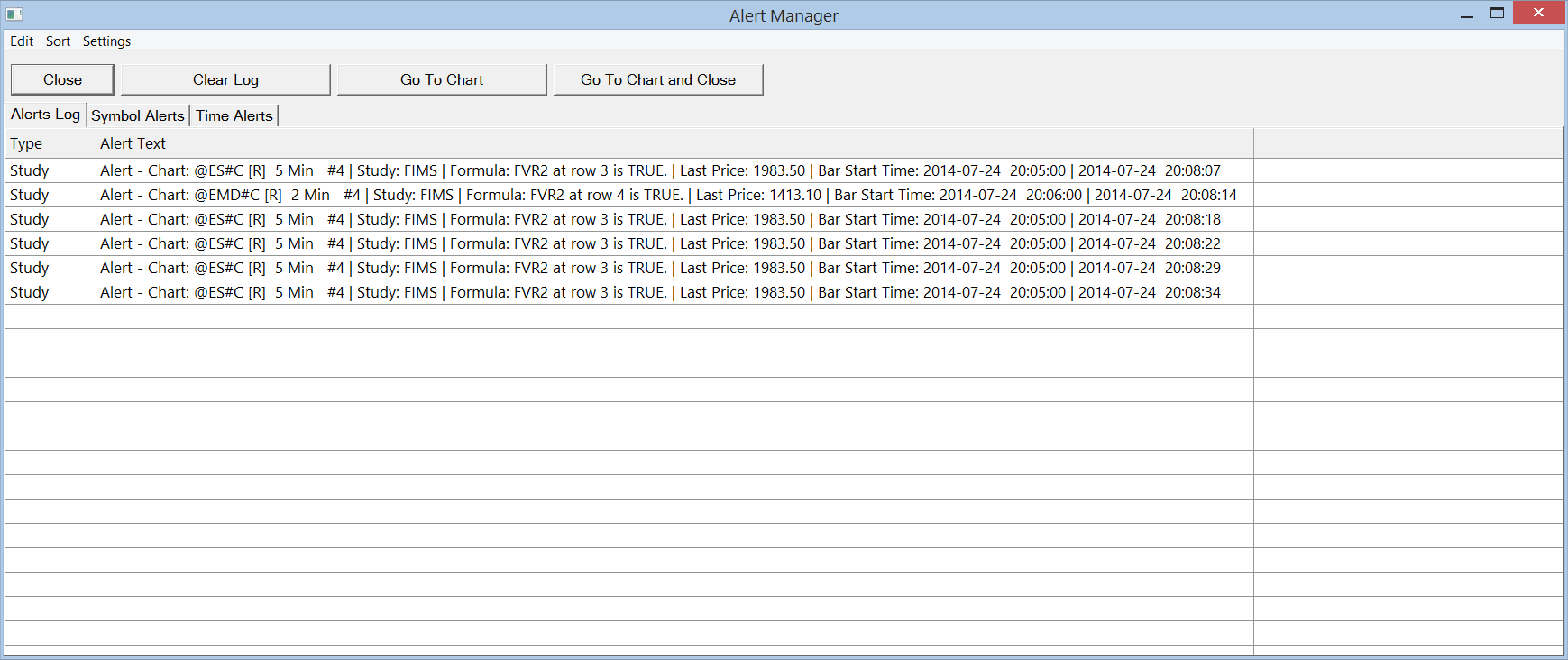You will still get an Alert Message whenever the study alert condition formula becomes TRUE. To make sure the Alerts Log does not automatically open, then disable Global Settings >> General Settings >> General 2 >> Show Alerts Log on Study Alert. Sierra Chart Support - Engineering Level Your definitive source for support. Other responses are from users. Try to keep your questions brief and to the point. Be aware of support policy: https://www.sierrachart.com/index.php?l=PostingInformation.php#GeneralInformation For the most reliable, advanced, and zero cost futures order routing, *change* to the Teton service: Sierra Chart Teton Futures Order Routing |