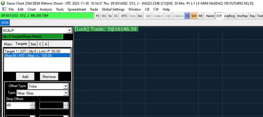 This absolutely should not be a problem, at least not with the Chart Settings. The Trade Window may need to be closed and re-opened to ensure the information gets updated. Can you please get us your Chartbook so we can take see if we can reproduce this with your chartbook. Let us know the particular chart on which you are having this issue. Refer to the following for how to attach a chartbook: Support Board Posting Information: Attaching a File (Optional) For the most reliable, advanced, and zero cost futures order routing, use the Teton service: Sierra Chart Teton Futures Order Routing |