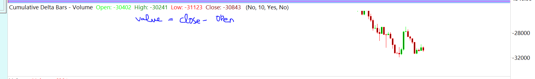 Hello, I'm interested in personalizing the CD chart. Specifically, I'd like to include some text to facilitate the calculation of the CD for a single candle. Please take a look at the attached picture for reference on what I'm aiming for. I would like to add a label Value , to calculate automatically the value of the CD candle , i.e Close value - open value . |