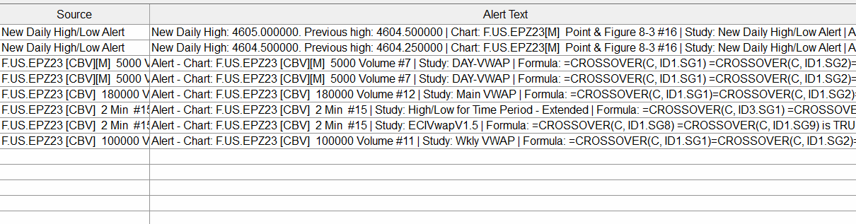 I'm trying to get my chart to alert me when my main main price graph ( volume based ) cross over my vwap study at the bands any time it cross over or under on every new bar once this was formula i used but get alert formula error these are the correct sg numbers for the study OR( CROSSFROMBELOW(5, SG2), CROSSFROMABOVE(5, SG3) OR( CROSSFROMBELOW(5, SG4), CROSSFROMABOVE(5, SG5) OR( CROSSFROMBELOW(5, SG6), CROSSFROMABOVE(5, SG7) OR( CROSSFROMBELOW(5, SG8), CROSSFROMABOVE(5, SG9) i have also tried this as well Or <=SG2 or >=SG2 Or <=SG3 or >=SG3 Or <=SG4 or >=SG4 Or <=SG5 or >=SG5 Or <=SG6 or >=SG6 Or <=SG7 or >=SG7 Or <=SG8 or >=SG8 Or <=SG9 or >=SG9 |