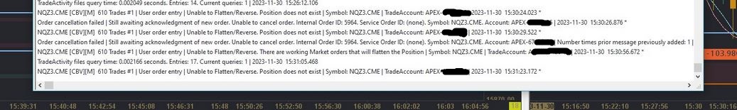 Hello, on Thursday, I tried to flatten a position four times in 1 minute without success (see screenshot). What is the cause of this error message? Is it a data feed issue (Rithmic) or an internet problem? Thank you in advance for your response. Best regards, Nico Date Time Of Last Edit: 2023-12-03 17:12:23
