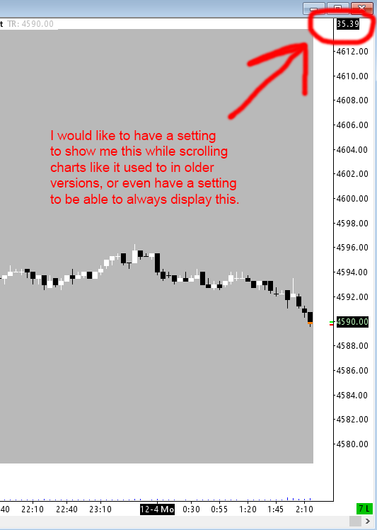 Could there not be a setting though that allows for the value to always be visible? When you look at a chart, your brain always has to do a calculation to figure out this range. (ie. for ES, low is 4630, high is 4670, so range is around 40). But this means that you're spending time to figure this out. If the market is moving fast, especially if you have the scale range set to automatic, you have no idea high wide the range is. Actually, I just tested it, and when you use the automatic range setting in this new version, you don't even see the scale range value as you compress or expand it by clicking on the scale and holding it as you slide up and down. There is no value visible to tell you how wide the scale is, and you have to look at the high and low numbers and do the calculation in your head to figure this out yourself. I think being able to always see this value is important. On the bottom scale, which is usually time, there is a very clear indication of this scale. (ie. 0, 1, 2, etc) You don't have to count the bar spacing yourself, the value is there to tell you. So I think the Y axis should also have the option to always have a value visible. |