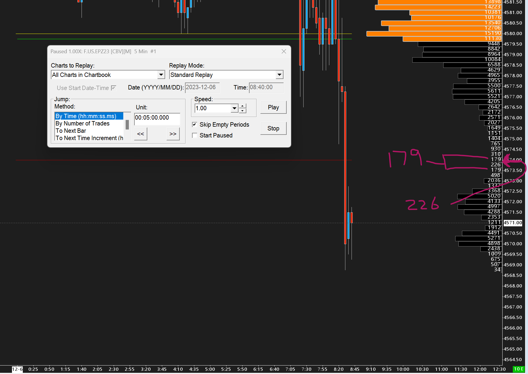 Please see attached image. At 12/6/2023 around 8:40am PT the ES contract shows a profile with a Valley at 4574.00 with 179 volume. There is a level at 4573.50 with 179 volume as well, with 226 volume in between. The Sensitivity was set to 8. According to the docs Volume By Price Study: Peaks and Valleys Sensitivity a Peak or Valley is only detected if all the volume "Sensitivity" ticks above and below are higher/lower, not equal. In the case when the sensitivity is set to 10, if the 10 price levels above and 10 price levels below a particular price level have a lower volume than the volume bar at the price level being compared to, then this will be considered a Peak Volume bar and a horizontal line is drawn outward from the Peak. In the case when the sensitivity is set to 10, if the 10 price levels above and 10 price levels below a particular price level have a higher volume than the volume bar at the price level being compared to, then this will be considered a Valley Volume bar and a horizontal line is drawn outward from the Valley. Please clarify the expected behavior, and why the higher 179 volume level was chosen, and not the lower, or perhaps why both were not identified? This seems to give misleading information, and another question if this is behaving as you have designed it, just how many (higher) levels could be between two low levels to have one/both identified as a valley? I am guessing you have a <= or >= in your code where it should be < and > only. Please advise. Depending on your response, I would assume either the docs or the code needs to be changed so they are in alignment. Thank you! Date Time Of Last Edit: 2023-12-06 22:30:46