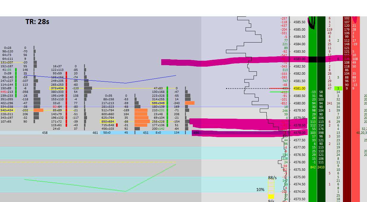 Is there a way to add a vol at price threshold alert to DOM? I want to highlight when pulling/stacking values are >100 by extending a line from DOM onto attached footprint chart? Attached image shows pull/stack columns marked with with arrow and values >100 highlighted onto chart.