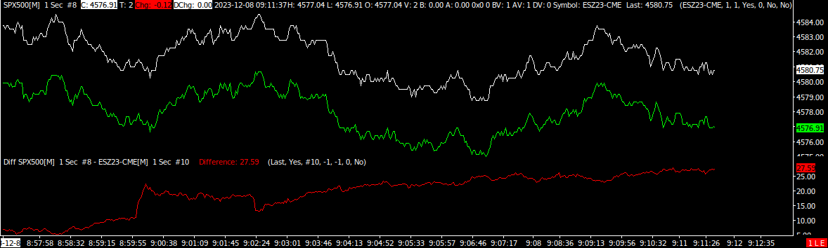 SierraCHart 2568 For symbol SPX500, create a 1sec-bar, line-on-close chart. Add study 'Add Additional Symbol' with symbol ESZ23-CME. Add study 'Difference (Single Line)', based on SPX500. First problem: The reference at Difference (Bar or Single Line) claims that for 'Input -> Chart 2 Number and Graph' any symbol added with a 'Add Additional Symbol' study should be available for selection. This is NOT the case. I can only choose from other charts. So, I create another chart for ESZ23-CME, 1sec-bar, line-on-close. In the SPX500 chart study 'Difference (Single Line)' I then reference this second chart. Second problem: The resulting difference chart in section 2 has obvious wrong values (see attached screenshot). https://www.sierrachart.com/image.php?Image=1702140286975.png Any ideas what the problem is here? |