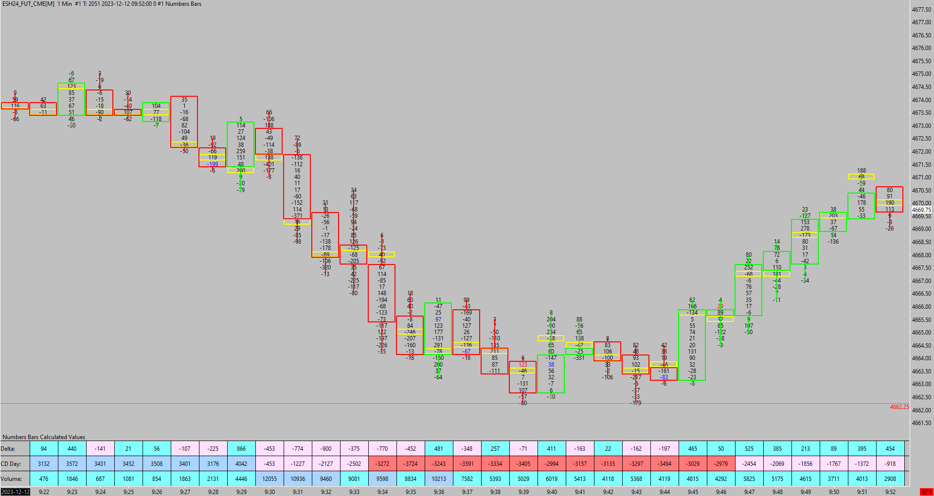 Good morning support board. I have a numbers bar chart that I want to display the Delta within the price lines, I have achieved this by setting the Column 1 Numbers Bar Text to 'Ask Vol Bid Vol Difference'. My question is, is there anyway that I can split the display to show 'Negative' numbers on the left and the 'Positive' numbers on the right, rather than in a single line. This separation would make easier viewing, I just can't seem to find anyway of doing this. It may be there is a way of just showing 'Negative' numbers in column 1 and 'Positive' numbers in column 2. I have attached a screen shot, maybe it will help in showing what I am trying to achieve. https://www.sierrachart.com/image.php?Image=1702455967354.png Thank you in advance for your time. Kind Regards Eddie |