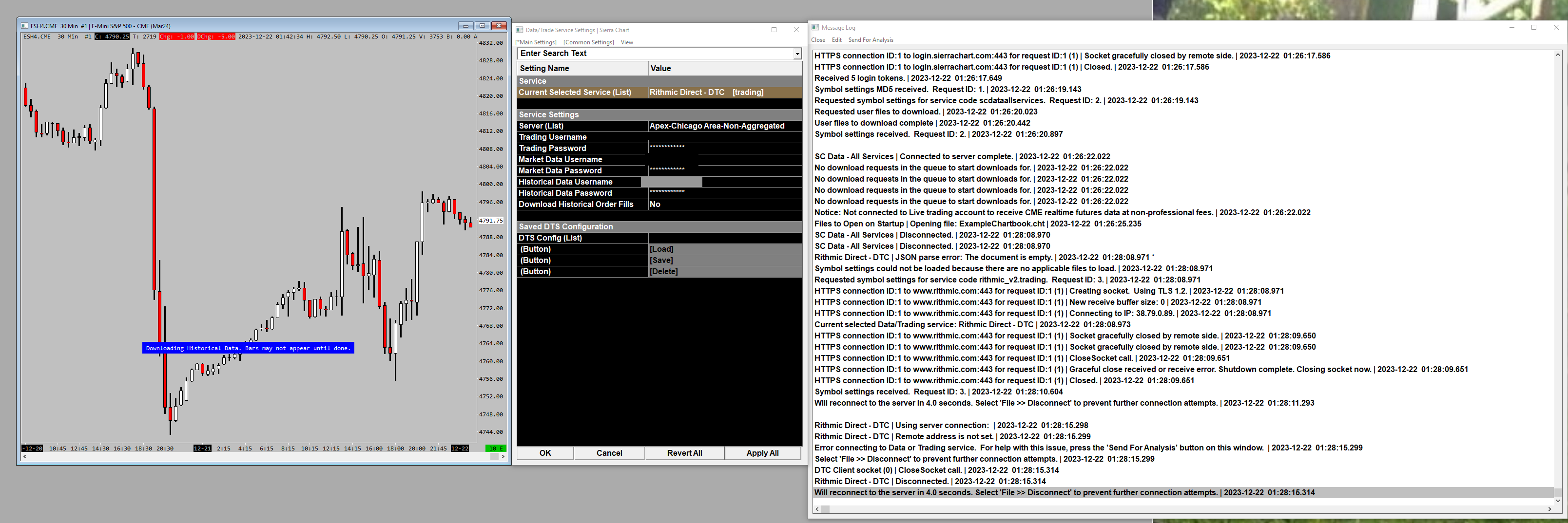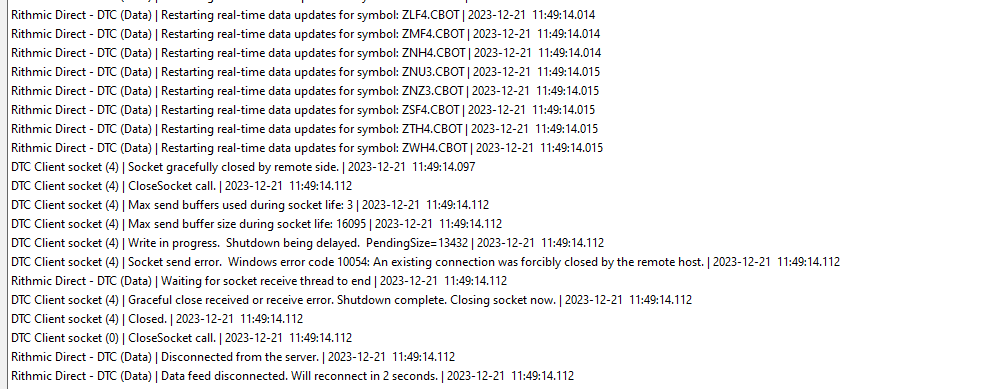 We have no idea why the version would make any difference. It makes absolutely no technical sense to us whatsoever. Unless we pass the version number to Rithmic. And Rithmic is treating different versions differently. There are no changes with Rithmic and this is definitely not a Sierra Chart issue. What we have been seeing lately over the last two months or so with Rithmic is when using invalid symbol they close the connection: DTC Client socket (4) | Socket gracefully closed by remote side. | 2023-12-21 11:54:16.833 DTC Client socket (4) | Socket send error. Windows error code 10054: An existing connection was forcibly closed by the remote host. | 2023-12-21 11:54:16.845 There are invalid symbols in the list of symbols being subscribed to which are invalid or expired. So you need to clean those up: Chart Data and Chart Data Files: Cleaning Up Old and Unused Symbols for Efficiency Sierra Chart Support - Engineering Level Your definitive source for support. Other responses are from users. Try to keep your questions brief and to the point. Be aware of support policy: https://www.sierrachart.com/index.php?l=PostingInformation.php#GeneralInformation For the most reliable, advanced, and zero cost futures order routing, use the Teton service: Sierra Chart Teton Futures Order Routing Date Time Of Last Edit: 2023-12-21 18:48:34
