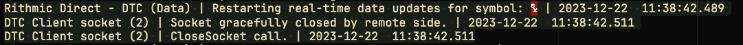 To preface Denali fixes this and should be the preferred provider for market data when using Sierra Chart, but I have done testing the best to my knowledge and I think a problem could be on Sierra's side. The issue seems to be with the Sierra4.config file. If I use my custom Sierra4.config file I get constant disconnect/reconnect for Topstep Rithmic when not using denali data. The error message prints to the log if I do not have open any chartbooks, custom quotes, etc. If I delete my custom Sierra4.config and force sierra to download a fresh one the constant disconnect/reconnect goes away. I make sure to set the datafeed back to Topstep Rithmic and disable the "Allow support for sierra data feeds" for testing purposes. I would hate to have to rebuild my custom Sierra4.config file from scratch if there was some sort of corruption. I could be missing a specific setting to fix the problem, but I tried for a couple hours flipping settings and had no success. I have attached two full message logs. One with my custom Sierra4.config and the other with a fresh Sierra4.config. The lines that seem to be the problem are "Rithmic Direct - DTC (Data) | Restarting real-time data updates for symbol: | 2023-12-22 11:38:42.489 DTC Client socket (2) | Socket gracefully closed by remote side. | 2023-12-22 11:38:42.511 DTC Client socket (2) | CloseSocket call. | 2023-12-22 11:38:42.511" The symbol for "Restarting real-time data updates for symbol" shows blank above, but in my text editor is a weird SX symbol. Thanks for the help. I use denali personally and with no issues, and push others to do the same, but this rithmic issue has been a problem for the last couple of months. Thanks again for the help! |