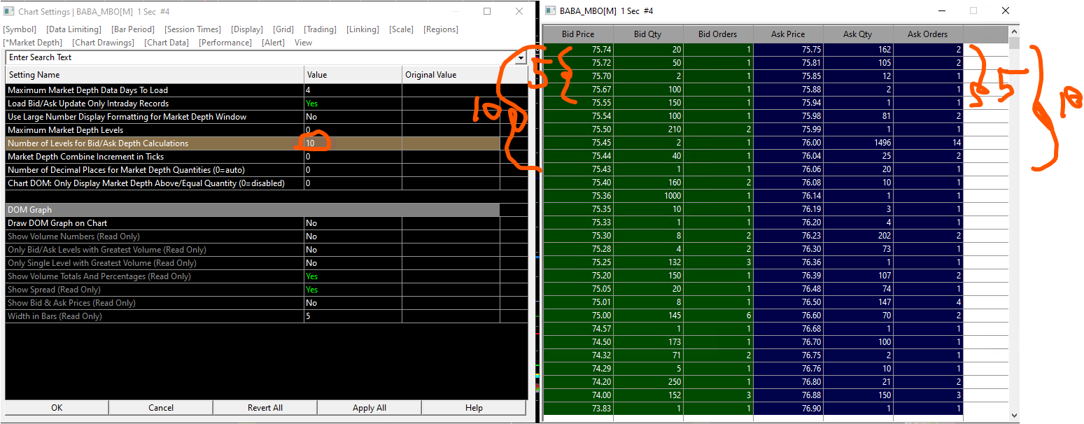 hello, as in the pic: if the value of "number of levels for bid/ask depth calculation" set to 10, 1. so it is the TOTAL value of levels (5 at the BID PRICE + 5 at the ASK PRICE= 10) ? or 2. it is the value of levels of EACH section (10 at the BID PRICE + 10 at the ASK PRICE= 20) ? thank you. Date Time Of Last Edit: 2023-12-26 11:42:06
