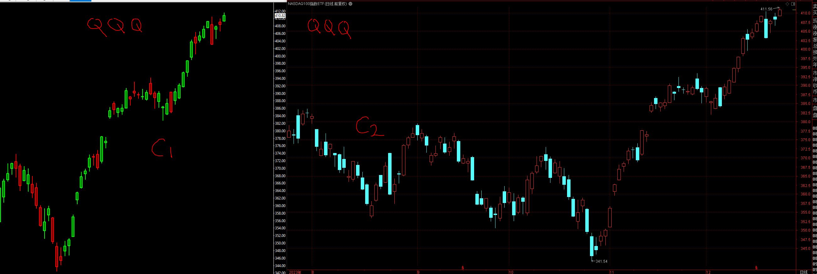 Hi, As shown in the attached, left C1 is the Candlestick bar of SC (QQQ) and right one C2 is from another tool, how can I get the same style bar to C2? (I need the Candlestick bar like C2). Thanks Charlie |