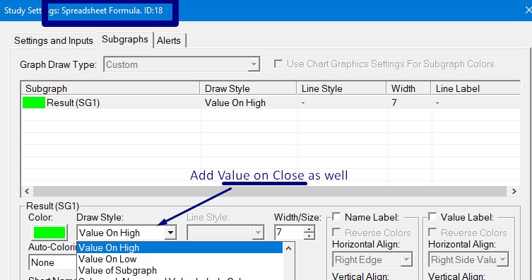 Hello, Is is possible to add a new "Draw Style" in Spreadsheet Formula" study? Currently I'm using either Value on High or Value on Low, Can you also add another option which is - Value on Close Thank you. |