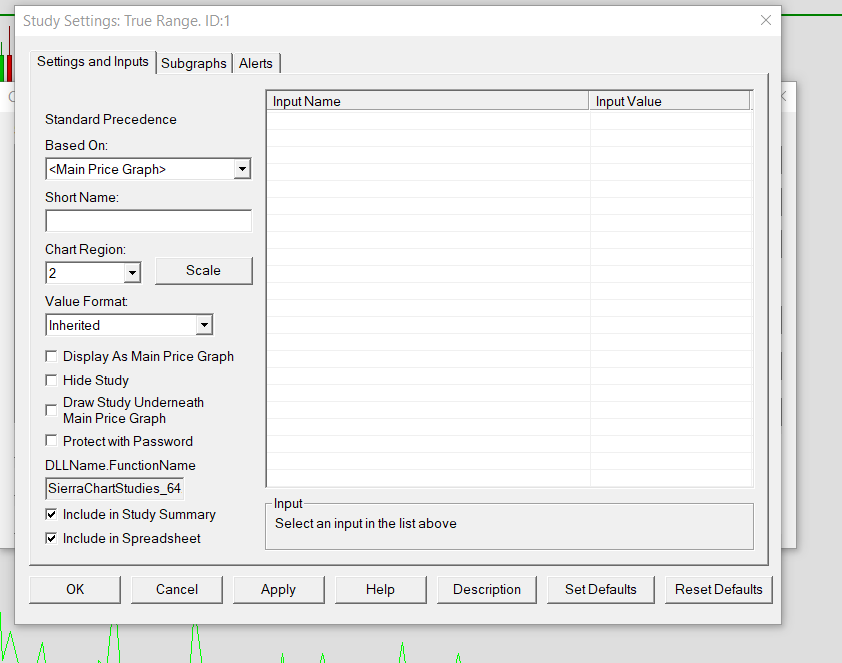 The True Range study has no inputs.To increase the number of bars to calculate, go to the Color Bar Based On Alert Condition study's settings. Date Time Of Last Edit: 2024-01-07 17:03:11