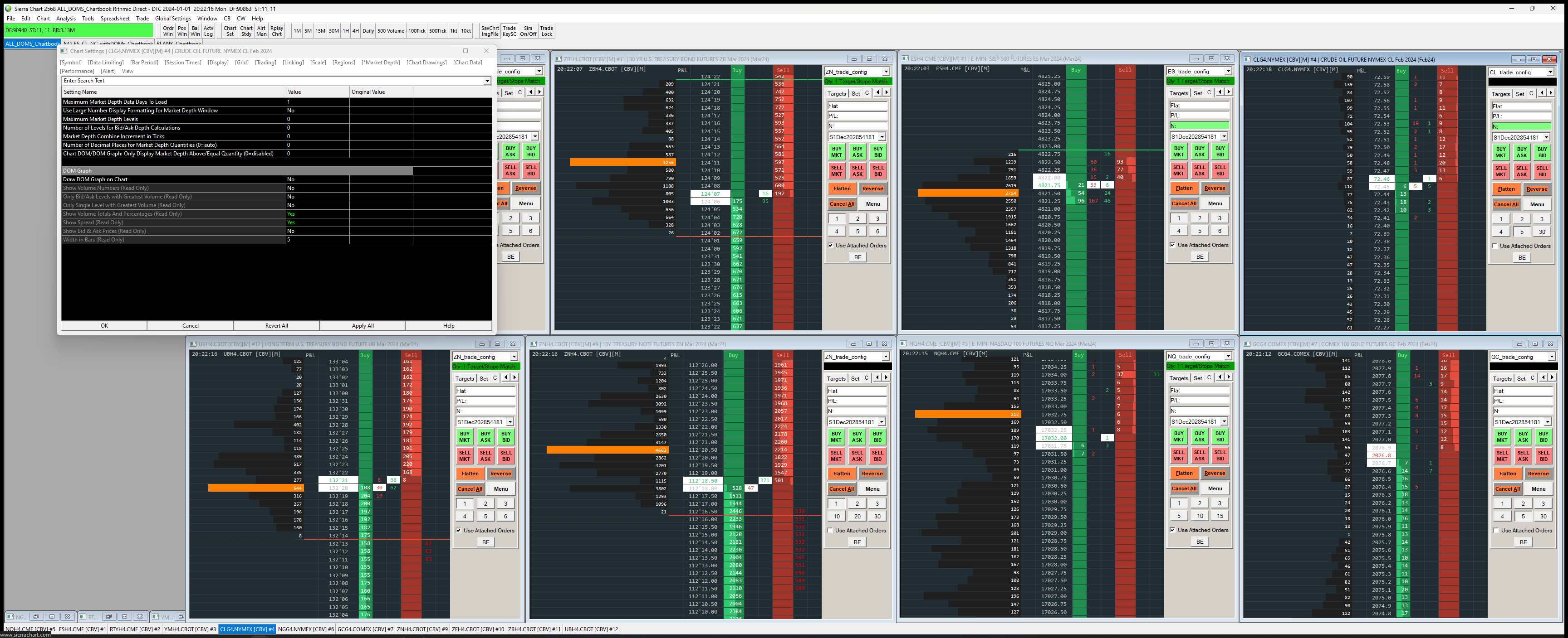 I have full market depth for the CME bundle. I will get random market depth inconsistencies across multiple products that either have no depth, or weird problems, such as the one shown in the uploaded image. The chart settings for CL is open, showing 0 for "Maximum Market Depth Levels", indicating to list them all. The CL DOM is on the top right of the screen. I am getting about 10 market depth levels on the Ask and 2-3 market depth levels on the bid. The same thing is happening with ES and NQ directly to the left, while GC has full market depth directly below the CL DOM. If I reconnect or shut down/restart SC it will usually go away. This problem comes and goes and I cannot identify why it is happening. I am currently connected to TopStep Rithmic, if that makes any difference. Any help would be appreciated. Thank you. Uploaded image link: https://www.sierrachart.com/image.php?Image=1704158539105.png |