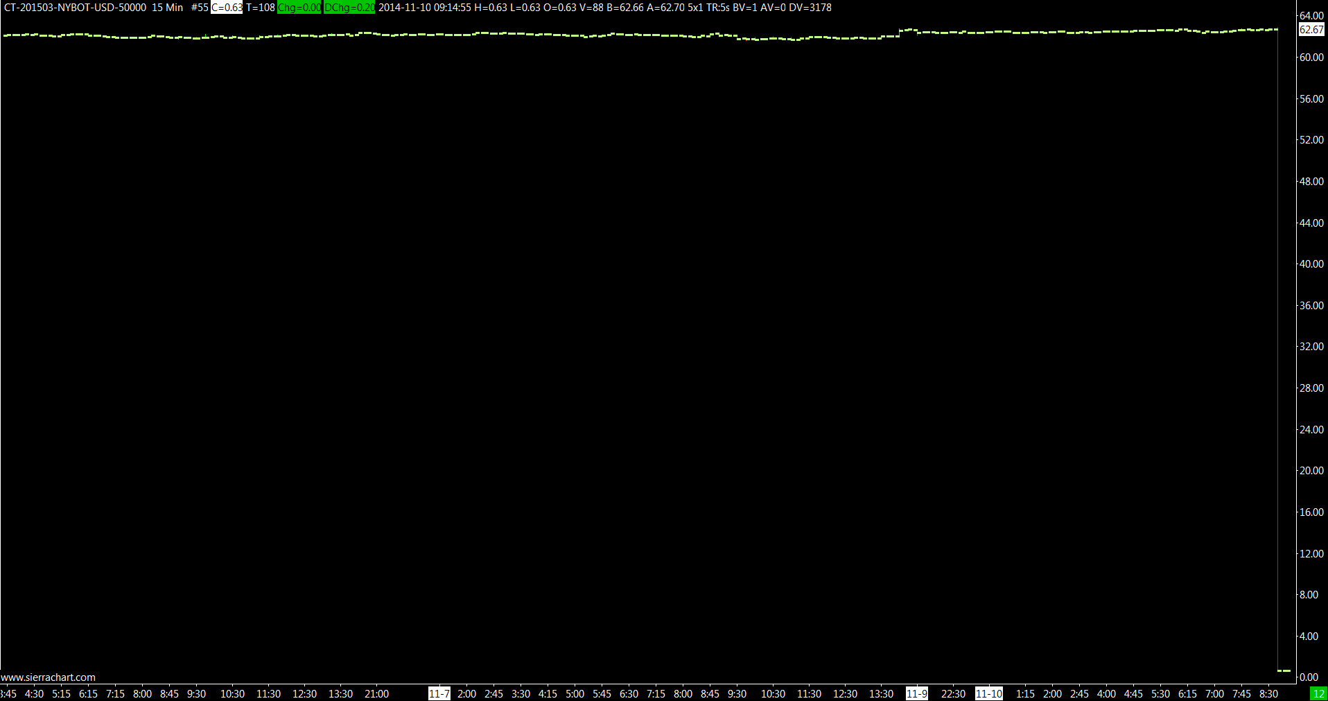 Hi, http://www.sierrachart.com/image.php?l=1415628905307.png Please if you can help me with the NYBOT ones. there are trades brewing. as for the CT, you will see that the price displayed on the right is 62 but it has gone down to 0.62 in the interim. if i adjust the data manually, it works until the next trade and then spikes down again. I have RT price multiplier at 100 and historical set to 1. this works with the december contract. I don't know why it goes haywire when I roll over. I also currently playing december KC and I am worried if I will have the same problem when I roll the coffee over too. thanks! |