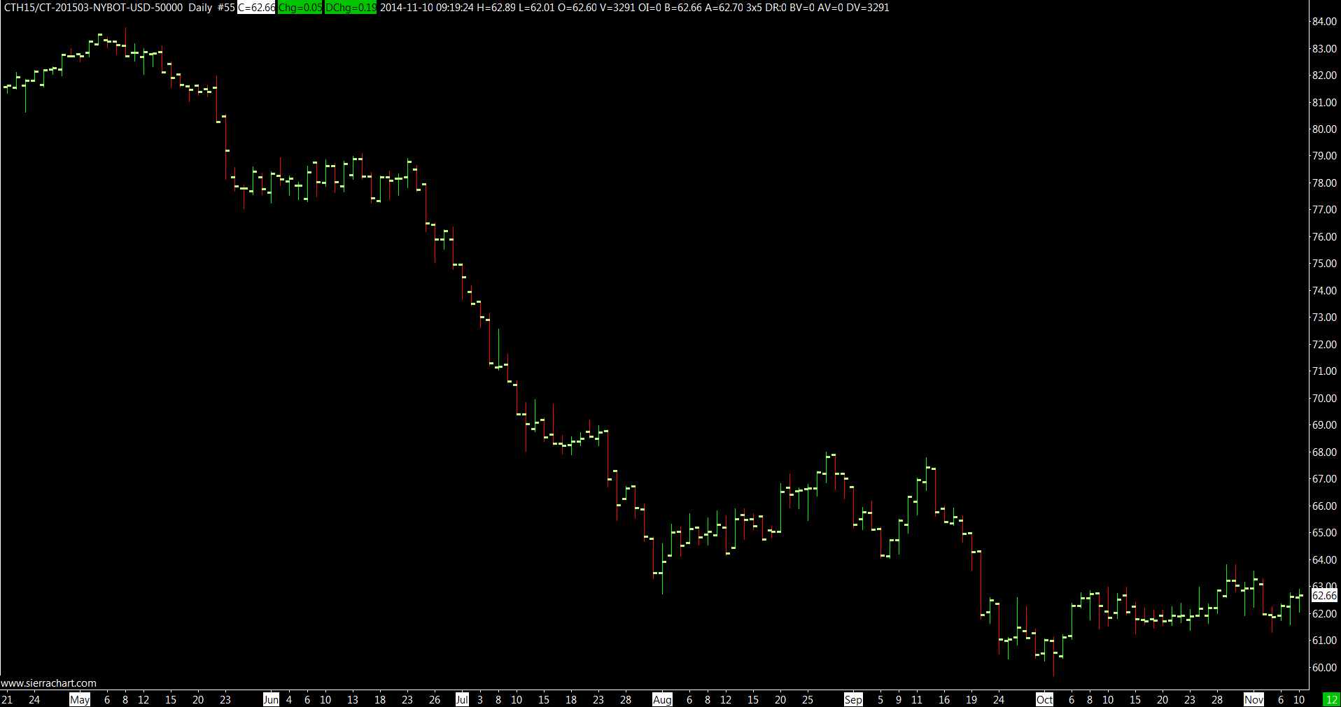 Hello, I am having this problem now with March Cotton on the NYBOT. also with interactive brokers This is a recurring problem with me each time I roll over the contracts. The reset did not work. As soon as I go intraday the price goes from 62 to 0.62 Please, if you could fix this permanently for the NYBOT commodities I would be must appreciative. Currently working March Cotton CTH15 But the problem recurs when I rollover KC (coffee), SB (sugar), OJ (orange). I love SC and this is the only bug. Please if you can fix March cotton ASAP because form the daily, it is setting up for a trade. I need to be able to go intraday to execute. With thanks, M |