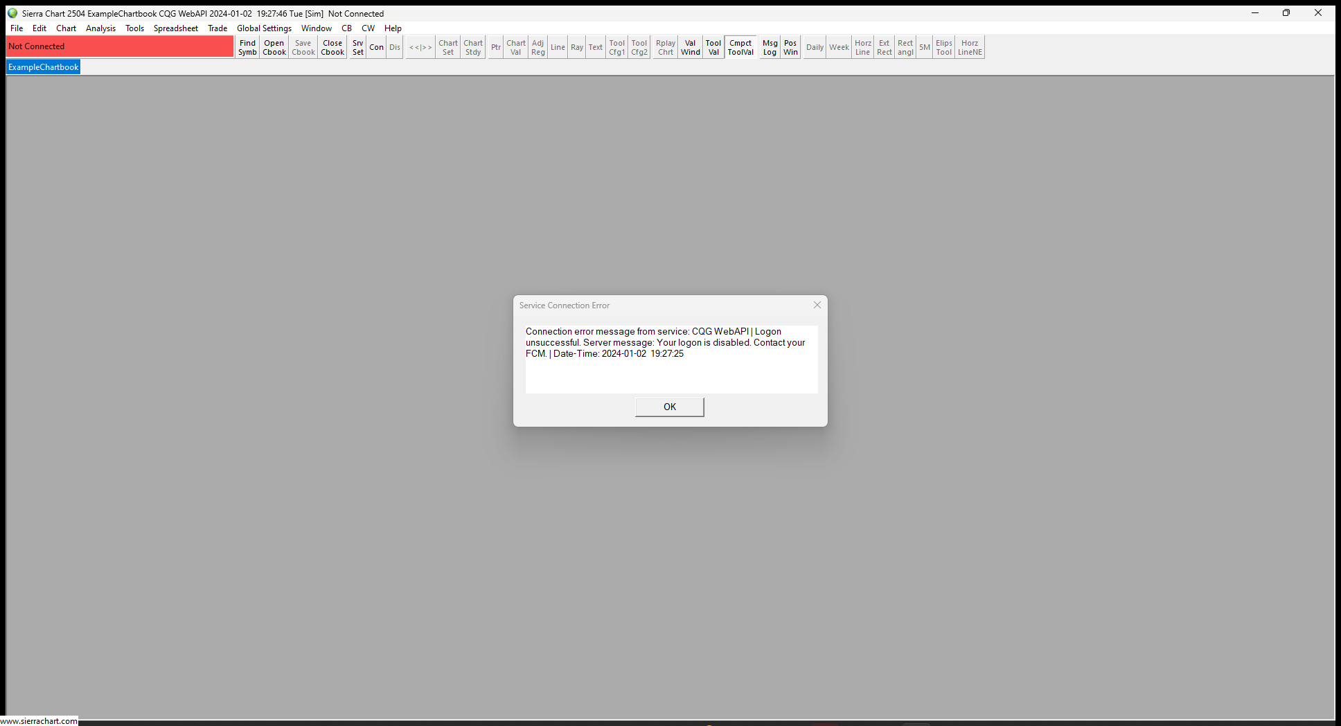 Regarding this, see number 12 here: CQG Trading Platform Service: Common Error Messages In the meantime: To access historical and streaming market data independent from your Trading service. Follow these instructions. Set "Global Settings >> Data/Trade Service Settings >> Current Selected Service" to "SC Data-All Services". Press "OK" And then translate the symbols in your Chartbooks and Sierra Chart using this "Edit' menu command: Edit Menu: Edit >> Translate Symbols To Current Service (Translate Symbols to Current Service) You can then use the data provided by Sierra Chart independent of your trading service. Sierra Chart Support - Engineering Level Your definitive source for support. Other responses are from users. Try to keep your questions brief and to the point. Be aware of support policy: https://www.sierrachart.com/index.php?l=PostingInformation.php#GeneralInformation For the most reliable, advanced, and zero cost futures order routing, use the Teton service: Sierra Chart Teton Futures Order Routing |