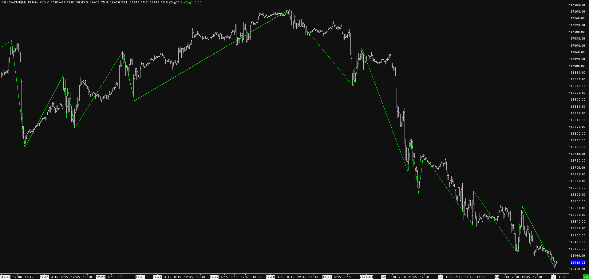 ACSIL programming assistance request I'm attempting to use the sc.ZigZag function ACSIL Interface Members - Functions: sc.ZigZag() option 2 SCFloatArrayRef ZigZag (SCFloatArrayRef InputDataHigh, SCFloatArrayRef InputDataLow, SCSubgraphRef Out, float ReversalPercent, int StartIndex); Auto-looping only. I've attached my code below. Ive attempted to use sc.BaseData and sc.BaseDataIn (with inputs) but neither are producing results in the subgraph. any assistance appreciated Tim code follows. /*==========================================================================*/ // The top of every source code file must include this line #include "sierrachart.h" // Name of the custom study. SCDLLName("ZigZag111") /*==========================================================================*/ SCSFExport scsf_ZigZag111(SCStudyInterfaceRef sc) { SCSubgraphRef Subgraph_ZigZag1 = sc.Subgraph[0]; // SCInputRef Input_InputData1 = sc.Input[1]; // un comment these to use with inputs below if used // SCInputRef Input_InputData2 = sc.Input[2]; if(sc.SetDefaults) { sc.GraphName="ZigZag11"; sc.AutoLoop = 1; sc.GraphRegion = 0; Subgraph_ZigZag1.Name="ZigZag1"; Subgraph_ZigZag1.DrawStyle = DRAWSTYLE_LINE; Subgraph_ZigZag1.PrimaryColor = RGB(0,255,0); Subgraph_ZigZag1.DrawZeros = false; /* // un comment these to use with inputs below if used Input_InputData1.Name = "Input Data1"; Input_InputData1.SetInputDataIndex(SC_HIGH); Input_InputData2.Name = "Input Data2"; Input_InputData2.SetInputDataIndex(SC_LOW); */ return; } float ReversalPercent = 0.17; // change here for now as req // un comment this to use with inputs above if used // sc.ZigZag(sc.BaseDataIn[Input_InputData1.GetInputDataIndex()], sc.BaseDataIn[Input_InputData2.GetInputDataIndex()], Subgraph_ZigZag1, ReversalPercent, sc.Index); sc.ZigZag(sc.BaseData[SC_HIGH], sc.BaseData[SC_LOW], Subgraph_ZigZag1, ReversalPercent, sc.Index); // /* SCString MessageString; MessageString.Format("Subgraph_ZigZag1 %f sc_Index %d" , Subgraph_ZigZag1[sc.Index], sc.Index); sc.AddMessageToLog(MessageString, 0); // */ } /*==========================================================================*/ nothing follows |
