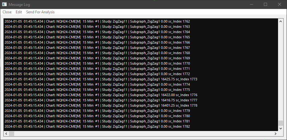 You might try MessageString.Format("Subgraph_ZigZag1 %f sc_Index %d" , Subgraph_ZigZag1[sc.Index], sc.Index); or for better formatting MessageString.Format("Subgraph_ZigZag1 %.02f sc_Index %d" , Subgraph_ZigZag1[sc.Index], sc.Index); For my code, I use ZigZag2, but I do know that sample in studies7 works for either. As I recall, the values in your Subgraph_ZigZag1[sc.Index] will be -1, 0, or 1, so you probably don't want to display those in same region as the main chart. As for your own use, changing to sc.AddMessageToLog(MessageString, 1); |