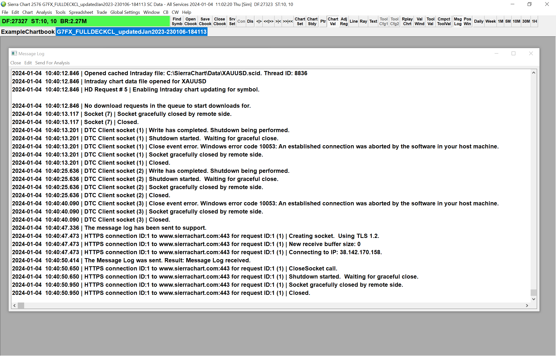You are getting a "Windows Error 10053". Refer to the following regarding this: Data/Trading Service Connection and Symbol Issues: 1.2. Network Communication or Server Problem For the most reliable, advanced, and zero cost futures order routing, use the Teton service: Sierra Chart Teton Futures Order Routing |