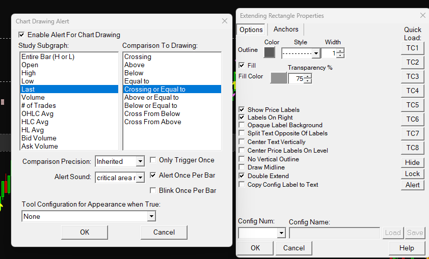 Hi John, Would you see any potential issue with the below: - CREATE the extended rectangle on a regular CANDLESTICK chart - COPY chart drawings from candlestick chart to a TPO chart - I can modify/move the rectangle on the TPO chart (like I wanted originally) - the alert condition would be evaluated based on the bar in the candlestick chart being equal/crossing the rectangle borders - If I use (alert once per bar) on the alert, When a new bar forms on the candlestick chart the alert condition is active again and I should be getting the alerts if the bar once again equals/crosses the rectangle borders |