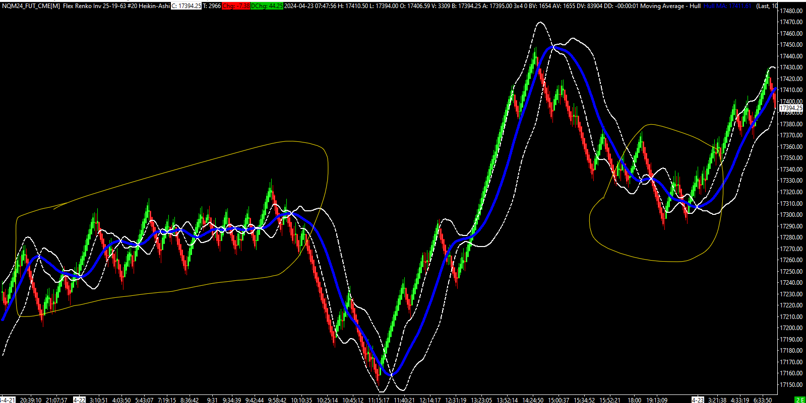 Hello, So I believe I followed your instructions utilizing the ATRBands study (user contributed) with 2 different MAs. The first being the HULL with a 100 length and I believe I may be doing something wrong because at some points (yellow circle) the bands cross each other and the HULL itself. The second MA is user contributed and is AMA: Adaptive Stochastic Moving Average With Filters. When that is placed it completely minimizes that chart |