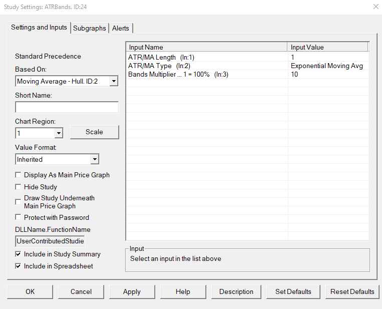 We are not sure what "ATR Bands" study you are referring to. But in general, if you want to apply a Moving Average that is not part of the existing list of options, you can just set the "Moving Average Length" to be 1, which will give you no averaging. Then use the particular Moving Average study you want and use the "Based On" to apply it to the particular study you want. Refer to the following: Chart Studies: Settings and Inputs Tab >> Based On - Basing a Study on Another Study For the most reliable, advanced, and zero cost futures order routing, use the Teton service: Sierra Chart Teton Futures Order Routing |
