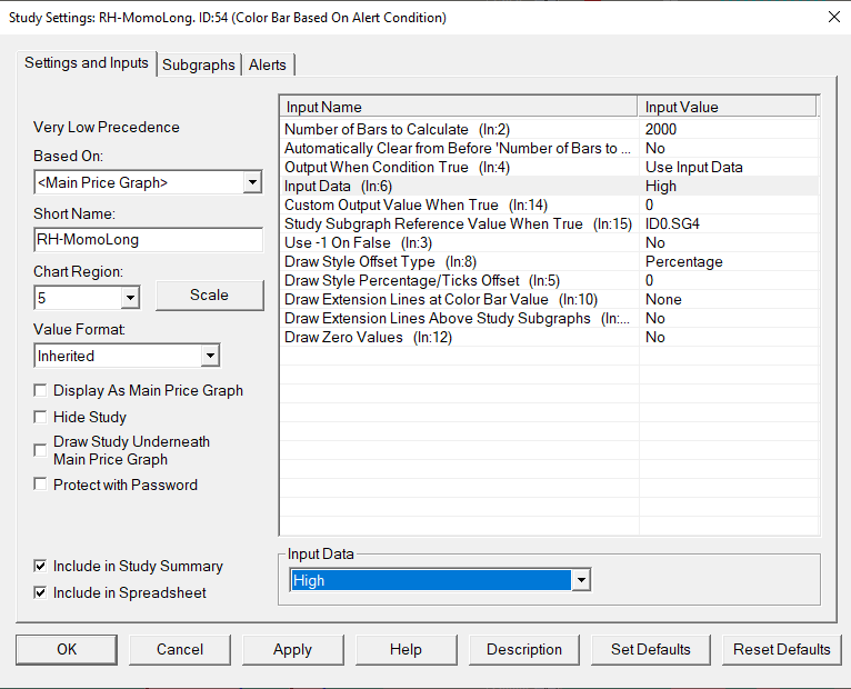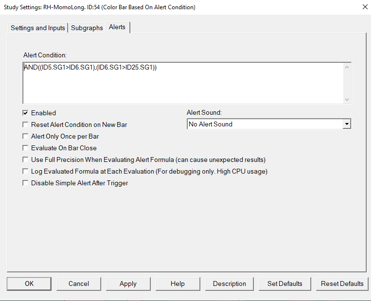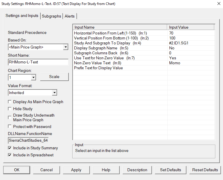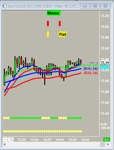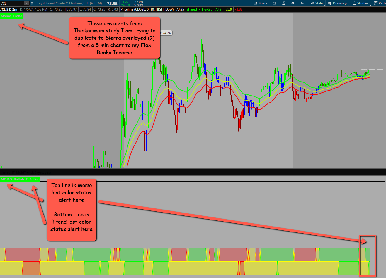 On the 5 minute chart attachment 2014-01-04-15-41-33.png I provided you. Here is an attachment of the ThinkorSwim alerts/study chart that I am trying to duplicate on Sierra. 2024-01-05_18-16-45.png Yes, on my 5 minute Sierra Chart, do you see the word "Momo" with Green Background on the 5 minute chart, and the next level below that is a red block and the word FLAT in yellow background on the third level down? Those are the Text Display that are color matched to the status of the alert on the bottom two diamond lines, currently Green diamond on first line of alerts and Yellow on the 3rd line of alerts. I have not been able to have the alert position on the left as it is on Thinkorswim so I just had to set the vertical/horizontal place for each of the alerts, green/red/yellow for each Momo or Trend line. I would prefer to have the alert condition in the upper left corner, but when I had them set to the same location, the overlap was not accurate and the edges bled beyond the box. |