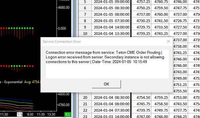 I frequently get a pop-up with a connection error message about a Secondary instance not allowing a connection to the server (Service log below). I am only running a single instance of Sierra Chart and only on one computer. What is causing this? Teton CME Order Routing | Requesting Trade Positions data. | 2024-01-05 09:38:09.439 Denali Data Feed | MaxConnectionsDifferentDevices = 1, NumCurrentConnectionsDifferentDevices = 1 | 2024-01-05 10:15:49.658 Denali Data Feed | MaxConnectionsForSameDevice = 3, NumCurrentConnectionsForSameDevice = 2 | 2024-01-05 10:15:49.658 Teton CME Order Routing | Requesting trade accounts from server. | 2024-01-05 10:15:51.850 TradeActivity files query time: 0.010127 seconds. Entries: 0. Current queries: 1 | 2024-01-05 10:15:51.860 Teton CME Order Routing | Performing query for most recent order fills Date-Time for Trade Account: 44905. | 2024-01-05 10:15:51.889 Teton CME Order Routing | Performing query for most recent account balances Date-Time for Trade Account: 44905. | 2024-01-05 10:15:51.889 Teton CME Order Routing | Received 1 accounts from service. | 2024-01-05 10:15:51.889 TradeActivity files query time: 0.004640 seconds. Entries: 0. Current queries: 2 | 2024-01-05 10:15:51.894 Teton CME Order Routing | Requesting historical order fills for account 44905. Start Date-Time UTC: 2023-12-28 17:00:00 | 2024-01-05 10:15:51.894 TradeActivity files query time: 0.000574 seconds. Entries: 0. Current queries: 1 | 2024-01-05 10:15:51.894 Teton CME Order Routing | Requesting historical account balances for account 44905. Start date-time UTC: 2024-01-05 16:38:04 | 2024-01-05 10:15:51.894 Teton CME Order Routing | Received 0 order fills for account: 44905. Inserting the ones that do not exist. | 2024-01-05 10:15:51.937 Teton CME Order Routing | Received 0 historical account balance updates for account: 44905. Inserting. | 2024-01-05 10:15:51.940 Teton CME Order Routing | Requesting Trade Positions data. | 2024-01-05 10:15:52.107 Denali Data Feed | MaxConnectionsDifferentDevices = 1, NumCurrentConnectionsDifferentDevices = 1 | 2024-01-05 10:15:52.570 Denali Data Feed | MaxConnectionsForSameDevice = 3, NumCurrentConnectionsForSameDevice = 2 | 2024-01-05 10:15:52.570 |