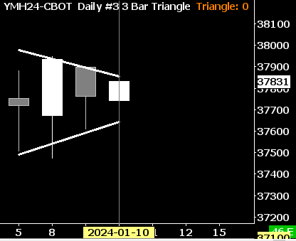 It should signal if current high is below EITHER of the 2 prior bars, and current low above either of the 2 prior bars, not both. It may be set to AND, and is not signaling on valid 3 bar triangles. Also, could it be possible to have it draw a triangle on the chart as shown? Thank you! |
