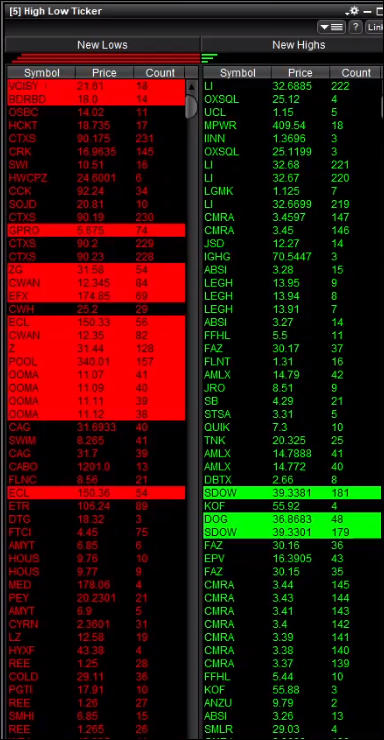 Hey Guys, is it possible to establish a new market stat which is showing how many stocks making a new daily high/low for specific index? I missed this in the whole bunch of available market stats. The ADR-SP for example shows only the ratio between how advance/decline but not how many from this advanced also making a new high and vice versa. E*Trade have something like this on their platform. This would be really helpful by analyzing the imbalance in the market. Many Thanks. Best Arthur Krieger |