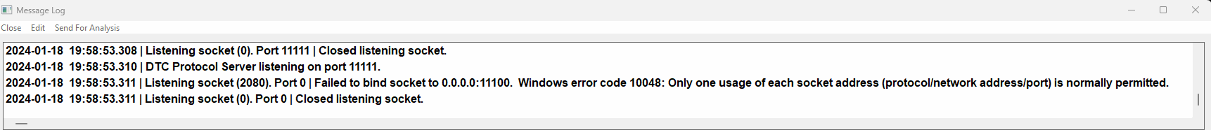 In the Sub-Instance set "Global Settings >> Sierra Chart Server Settings >> DTC Protocol Server >> Additional Listening Port" to "0". Then restart the sub-instance. For the most reliable, advanced, and zero cost futures order routing, use the Teton service: Sierra Chart Teton Futures Order Routing |