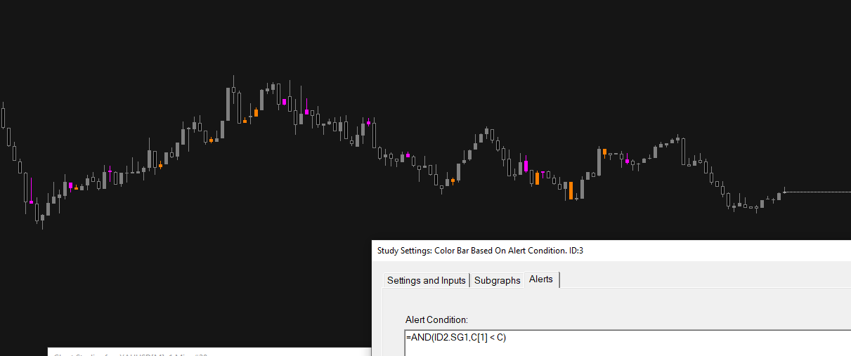 We are not sure exactly what you want to do, but in order to use the "Color Bar Based on Alert Condition" to color the bars when the volume is between 100 and 200, your condition would be the following: =AND(V > 100, V < 200) For the Inside Bar, to get an alert when the Inside Bar is true and the Study ID is 31, you would do the following: =ID31.SG1 If you want to use the Close of that bar for something, then you would probably use the Spreadsheet Formula to capture that information by using the following formula: =IF(ID31.SG1, C, 0) Note that the Spreadsheet Formula (despite its name) uses the Alert syntax. For the most reliable, advanced, and zero cost futures order routing, use the Teton service: Sierra Chart Teton Futures Order Routing |