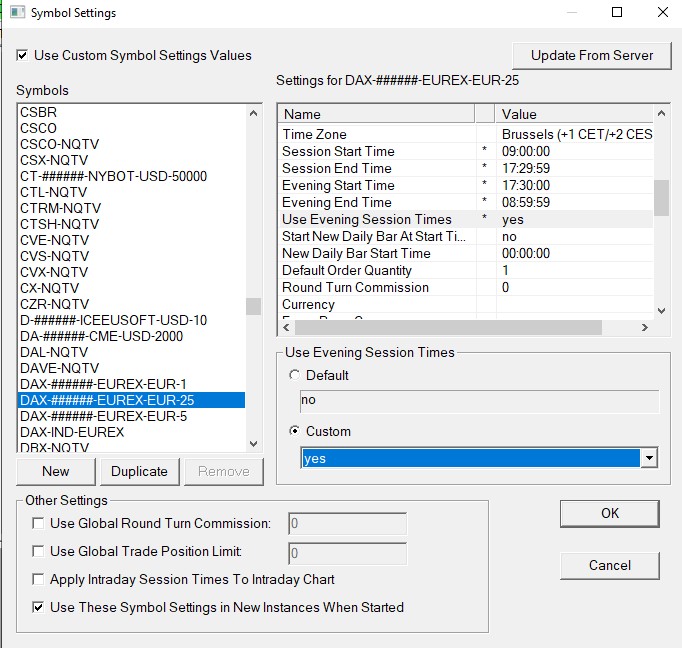 In my second instance of Sierra Chart my symbol and chart settings are not saved. I would like to save my market profile in the second instance with "use evening session". But this change is not saved when changing in the symbol settings or in the chart settings. Every time I reopen Sierra Chart the setting is back to "no". I have already checked the "use custom symbol setting values" box in the symbol settings, but the change is still not retained. Does anyone know what it could be? Thank you |