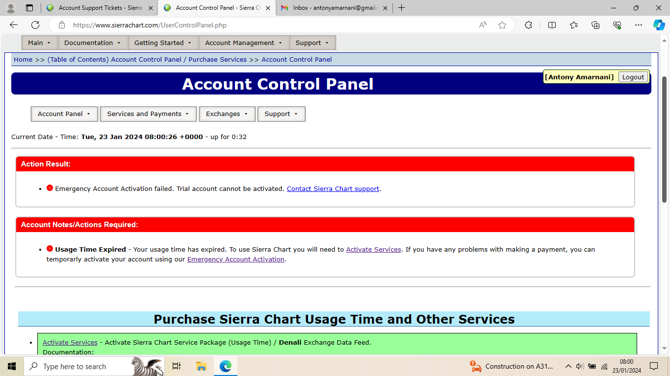 Hi Guys, I recently purchased a trading course from Intuitive Trading Institute with 5 - Advanced - 97.2 USD/3 Months" included for free in the price. I have selected this option in the add usage credit and clicked the update and renew now button however it does not seem to be working or register on my sierra chart platform. I have a message that states usage time has expired and Emergency Account Activation has failed and my Sierra chart platform advises me to contact you as shown in the screenshot included in this email. I wonder if it would be possible for you to reset the trail period and guide me on to how I can credit the 3 months live data feed courtesy of the Intuitive Trading Institute on my account. Many thanks for your help and assistance. Antony Amarnani |