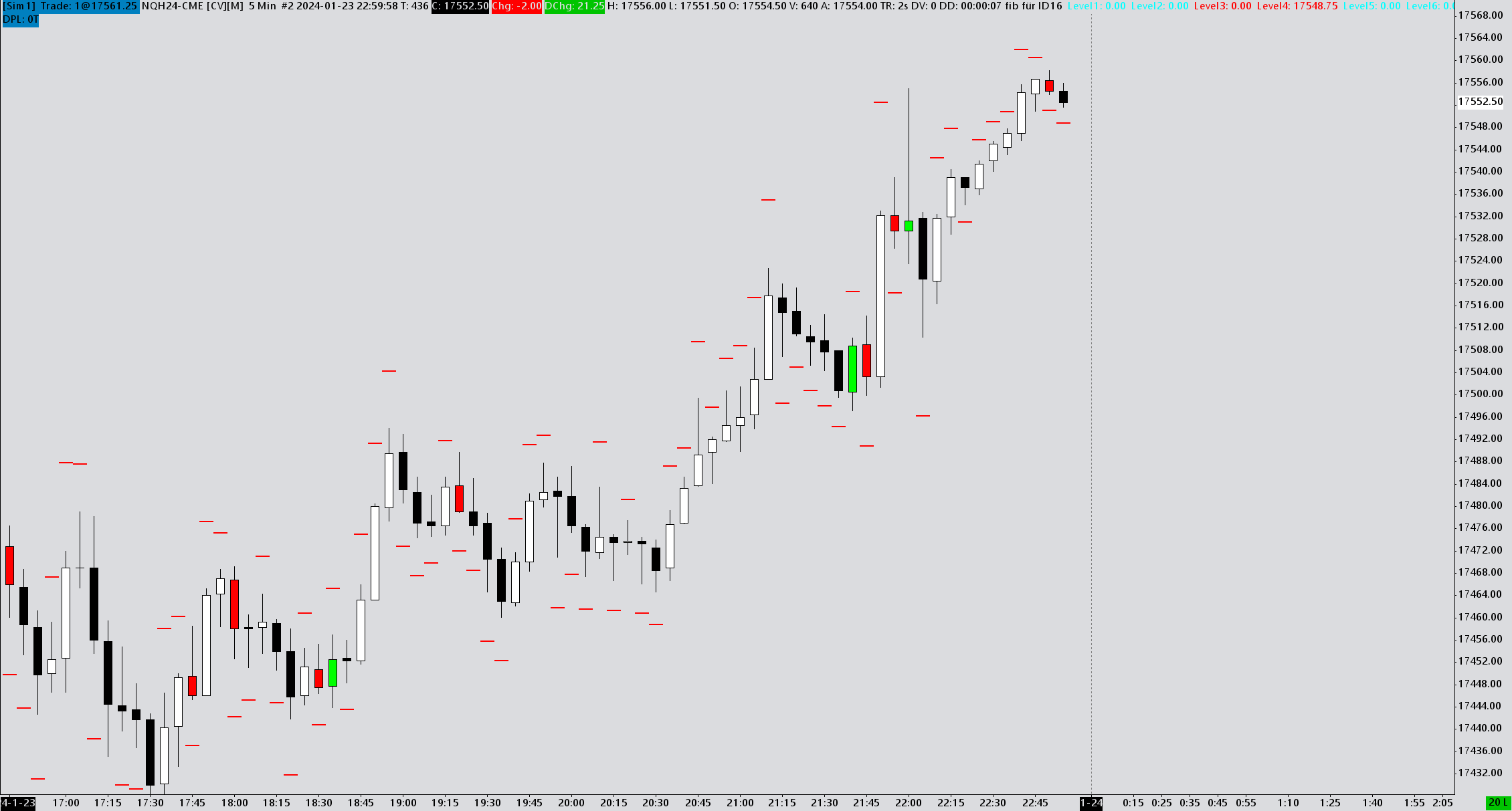 Hello, I have highlighted candles with the "Color Bar Based on Alert Condition" study. Now I would like to apply the "Auto Retracement/Projection" study to these candles only. To do this, I copied the alert condition from "Color Bar Based on Alert Condition" into the "Auto Retracement/Projection" study. Unfortunately, it does not work. The desired Fibonacci level is applied to all candles in the chart. However, they should only be applied to the colored ones. Here is a screenshot. How can I solve this? Thank you very much. https://www.sierrachart.com/image.php?Image=1706049938887.png |