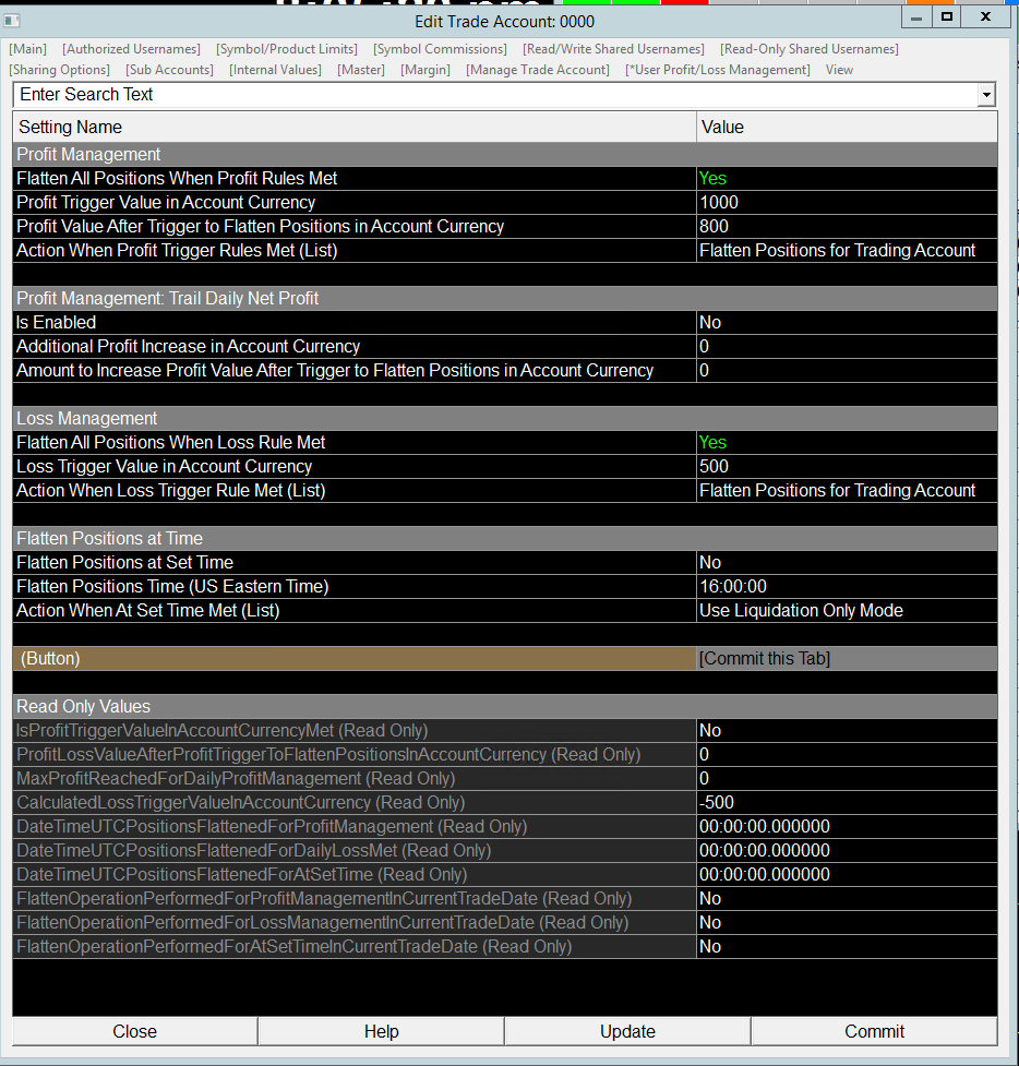 ok - regarding replay mode 2 of 3 three accounts I set for the profit trigger executed today and flatten positions. My next question is how I can see the trigger value of 1000 under 'read only values'? It appears the profit management is working but I am not able to see under 'read only values' at the bottom. Thanks, Hai-Nam |