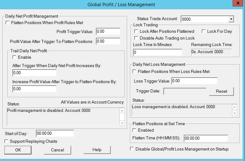 Hi Support, I watched the demonstration video on how to set up the user profit/loss management functionality. https://www.sierrachart.com/index.php?page=doc/VideoLibrary.php&Video=Server_Side_User_PL_Management I'm using a trading evaluator connection on a VPS testing a strategy and want to implement a profit trigger to flatten position if met. See screenshot of my edit trade account: 0000. You will see my loss management is set at -500 but the profit loss value after profit trigger does not show 800. I ran a chart replay test to see if the loss management would trigger but it didnt either. I checked Global Profit/Loss Management to see if there might be something conflicting but there is nothing enabled from that setting. Would I have to enable and/or match that setting too? See attached global profit/loss management screenshot? In summary, I have three trading evaluator accounts I would like to set separate profit/loss management for. Any help with setting this up is appreciated. Let me know if you have any questions. Thank you in advance for your help. Hai-Nam |
