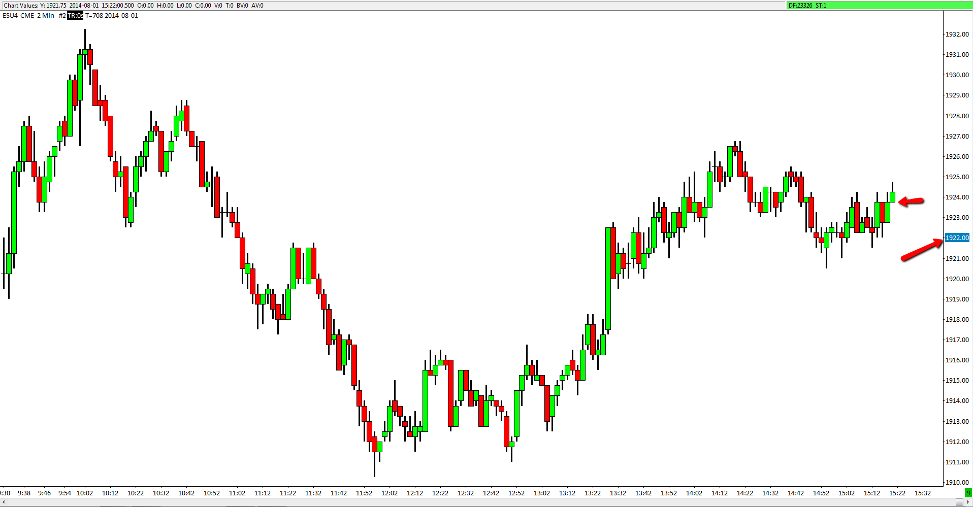 Starting today, when I start SC the historical bars are drawn but new bars are not being created. I can see the real time price moving on the price scale but no new bars. Tried disconnecting and reconnecting and tried "Edit/Download data - Intraday chart". An image is attached. Rithmic Data feed. SC Version 1167 Non-CLR. Log: File >> Disconnect selected. | 2014-08-01 15:30:19 Socket (1836) | Shutdown and closed. | 2014-08-01 15:30:19 Rithmic Trading | Disconnected from the server. | 2014-08-01 15:30:19 Rithmic Trading | Port for executable: 34303 | 2014-08-01 15:30:21 Rithmic Trading | Starting server: C:\SC_Optimus_NoCLR\Rim\DTCBridge.exe | 2014-08-01 15:30:21 Rithmic Trading | Connecting to the server 127.0.0.1. Port 34303 | 2014-08-01 15:30:23 Socket (1696) | Connected. | 2014-08-01 15:30:23 Rithmic Trading | Connected to server. | 2014-08-01 15:30:23 Rithmic Trading | Sending logon request message. | 2014-08-01 15:30:23 Rithmic Trading | Starting the connection process to data and trading service. | 2014-08-01 15:30:23 Rithmic Trading | Logging is enabled. Log file: Rithmic.log | 2014-08-01 15:30:23 Rithmic Trading | Connecting to Rithmic 01 US server. | 2014-08-01 15:30:23 Rithmic Trading | Server Alert: Market Data Connection Opened | 2014-08-01 15:30:25 Rithmic Trading | Server Alert: Market Data Connection Login Complete. Result text: "ok" | 2014-08-01 15:30:26 Rithmic Trading | Server Alert: Trading System Connection Opened | 2014-08-01 15:30:27 Rithmic Trading | Server Alert: Trading System Connection Login Complete. Result text: "ok" | 2014-08-01 15:30:27 Rithmic Trading | Server Alert: PnL Connection Opened | 2014-08-01 15:30:28 Rithmic Trading | Server Alert: PnL Connection Login Complete. Result text: "ok" | 2014-08-01 15:30:28 Rithmic Trading | Server Alert: Intraday History Connection Opened | 2014-08-01 15:30:29 Rithmic Trading | Server Alert: Intraday History Connection Login Complete. Result text: "ok" | 2014-08-01 15:30:30 Rithmic Trading | Server Info - Server Name: SC DTC Bridge. | 2014-08-01 15:30:30 Rithmic Trading | Server protocol version: 4. Client protocol version: 4. There is a protocol match. | 2014-08-01 15:30:30 Rithmic Trading | Successfully connected. IB='OptimusFutures'. | 2014-08-01 15:30:30 Rithmic Trading | Starting real-time market data updates for: ESU4-CME. ID: 1 | 2014-08-01 15:30:30 HD Request # 26 | Downloading Intraday chart data for ESU4-CME to the file ESU4-CME.scid. Service: cme | 2014-08-01 15:30:30 HD Request # 26 | Download start Date-Time: 2014-08-01 15:11:31.0 | 2014-08-01 15:30:30 HD Request # 26 | Using server: scdf2.sierracharts.com port 10149 | 2014-08-01 15:30:30 Socket (0) | Resolved address scdf2.sierracharts.com to IP 8.18.161.133 | 2014-08-01 15:30:30 Socket (2192) | Connected. | 2014-08-01 15:30:30 HD Request # 26 | Sending historical data logon request message. | 2014-08-01 15:30:30 HD Request # 26 | Requesting Intraday data. Start Date-Time: 2014-08-01 15:11:31. Record interval: 30. Symbol: ESU4 | 2014-08-01 15:30:31 HD Request # 26 | Decompressing data. | 2014-08-01 15:30:31 HD Request # 26 | Receiving Intraday data for ESU4-CME starting at 2014-08-01 15:11:31 | 2014-08-01 15:30:31 HD Request # 26 | Timestamp of first Intraday data file record written: 2014-08-01 15:11:31 | 2014-08-01 15:30:31 Socket (2192) | Shutdown and closed. | 2014-08-01 15:30:31 The network socket for historical data has been closed. | 2014-08-01 15:30:31 HD Request # 26 | Received 18 records from 2014-08-01 15:11:31 to 2014-08-01 15:20:00 (8.5 minutes) and wrote 18 records for ESU4-CME | 2014-08-01 15:30:31 HD Request # 26 | Intraday download COMPLETE for ESU4-CME. Completion time: 0s | 2014-08-01 15:30:31 Real-time Intraday chart data file updates started for ESU4-CME | 2014-08-01 15:30:31 Historical data request is discarded because it is not for earlier data. | 2014-08-01 15:30:31 Rithmic Trading | Requesting Trade Positions data. | 2014-08-01 15:30:35 Current selected Data/Trading service: Rithmic Trading | 2014-08-01 15:31:36 Current selected Data/Trading service: Rithmic Trading | 2014-08-01 15:32:05 |