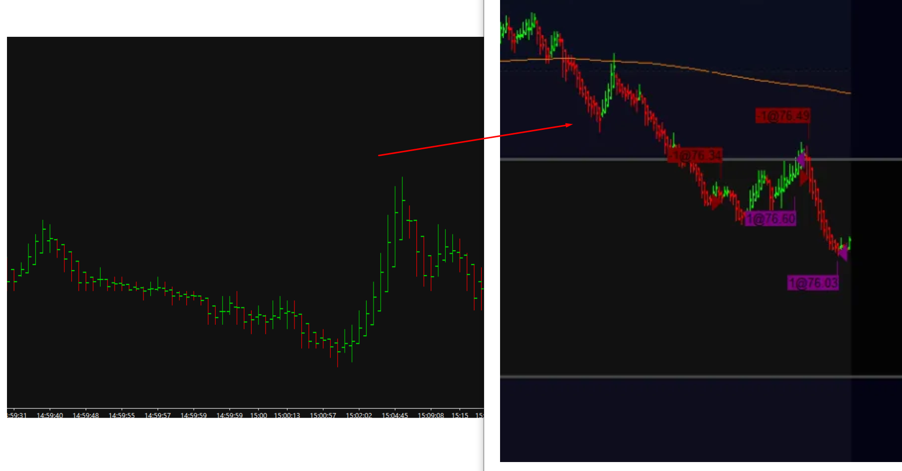 We are not sure exactly what you are looking for, but here are some thoughts. If you want the bars to be completely red or completely green then make sure the option for "Global Settings >> Graphics Settings >> Other >> Color Entire OHLC Bar the High/Low Color" is enabled. Refer to the following: Graphics Settings: Color Entire OHLC Bar the High/Low Color (Global Settings >> Graphics Settings >> Other) If you are wanting to use the Heikin-Ashi Study, then refer to the following: Heikin-Ashi For the most reliable, advanced, and zero cost futures order routing, use the Teton service: Sierra Chart Teton Futures Order Routing |