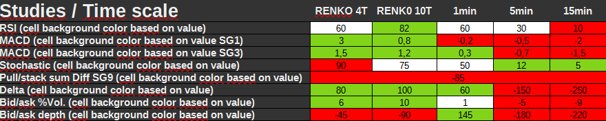Hi, I would like to create a table that summaries all my main studies values for every time-frame I use. These studies are located in different charts in a single chartbook. The background of each cell has to be color coded so I can analyse the situation in a glimpse of an eye (3 colors : Green (bullish), white (neutral), red (bearish)) I made a "skeleton" of what should look like the table (see attached file). 1) Is there already an study that allows to do this kind of table ? 2) If not, what is the best way to achieve this ? Spreadsheet or custom study ? I've never used spreadsheet but my understanding is that it doesn't allow to color code the background of each cell ? Regards, Sébastien |