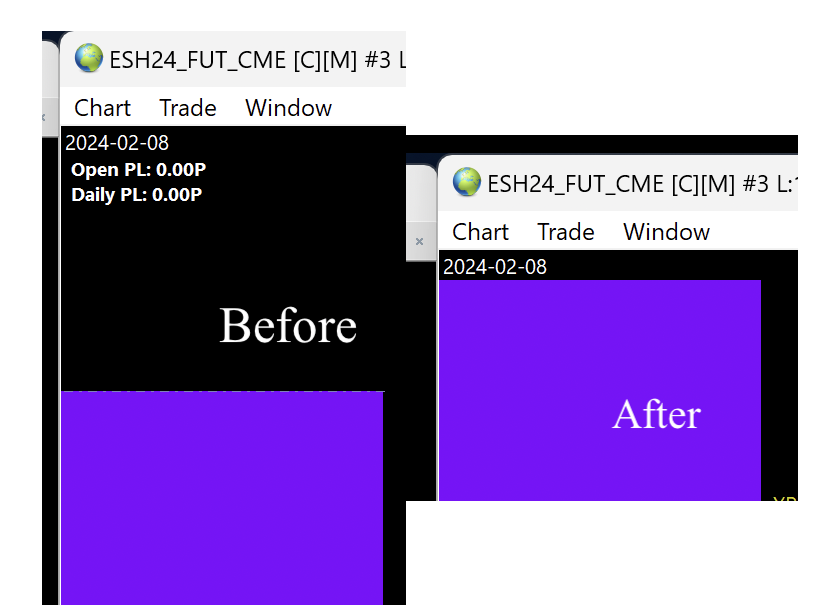SUMMARY: P/L Text is overwritten by background on Trading DOM, rendering P/L invisible. Open a Trading DOM: 1) open a study that will color the background using the Draw Styles "Fill Top" and "Fill Bottom"; you can use Volume Value Area Lines or you can Overlay any outside study; the result is the same; 2) open the study Trading: Profit/Loss Text; No matter what order you put the studies in, or what study settings you use (including "Draw Study Underneath Main Price Graph"), the colored background will always overwrite the P/L text, hiding it from view. It is impossible to put the P/L text on top of the background. This behavior does not happen on regular charts; only on the Trading DOM. The screen shot shows the before and after of scrolling up; you can see the purple background covers the P/L. I have wrestled with this for several days; no combination of settings produces the correct behavior. SC: please add an option to the P/L Text study for "Draw Above Main Price Graph", like is available on the Clock study. Both the Clock and P/L should be on top of everything else. Date Time Of Last Edit: 2024-02-09 07:29:53