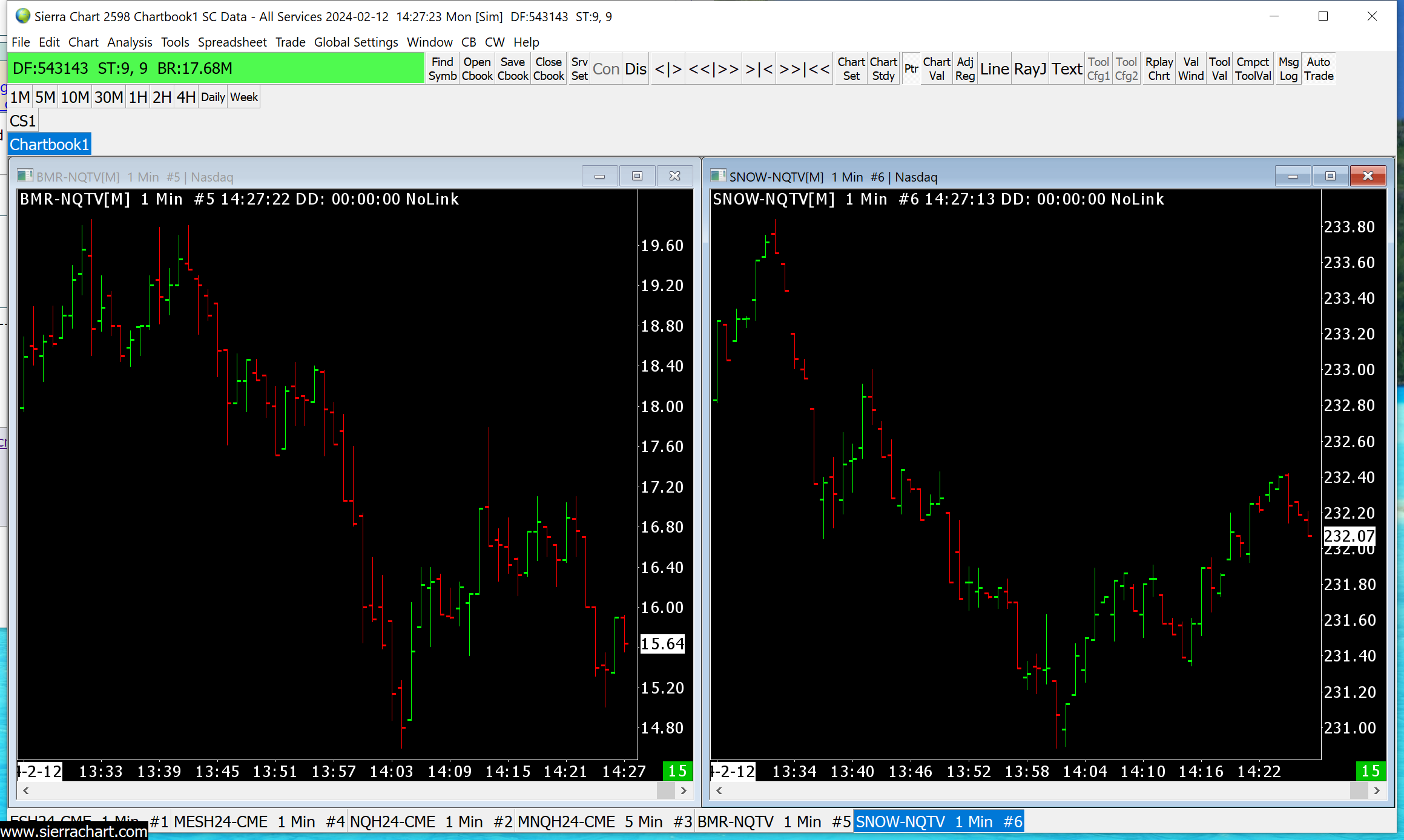We are not seeing any issues with the data for SNOW-NQTV or BMR-NQTV. Attached is an image showing both of these. We do not list all the symbols in the "File >> Find Symbol" window, so if you are not seeing a stock listed in there, then you just need to type in the name in the Find Symbol window and then open a chart for it. We can not give refunds for the exchanges, as those fees go to the exchanges themselves and they do not give refunds. We can give you refund for you package. If you want us to do this, then please post in the Account Support Tickets and let us know. Please reference this ticket when you do so. For the most reliable, advanced, and zero cost futures order routing, use the Teton service: Sierra Chart Teton Futures Order Routing |
