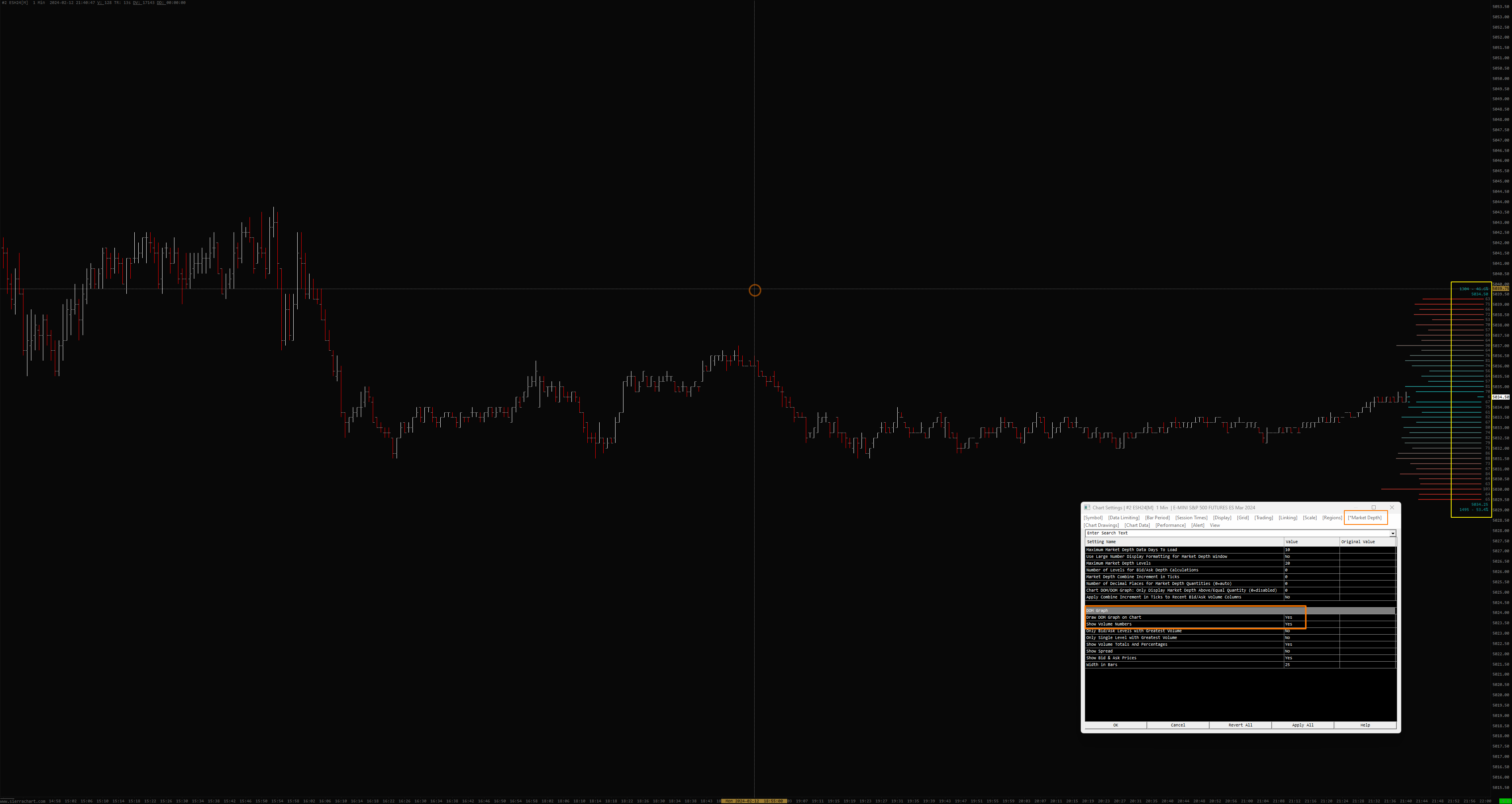 [This post has been updated] You can view the numbers for the DOM Graph by enabling the option for "Chart >> Chart Settings >> Market Depth >> Show Volume Numbers" under the DOM Graph section. Refer to the following: Chart Settings: Show Volume Numbers (Chart >> Chart Settings >> Market Depth >> DOM Graph menu) For the most reliable, advanced, and zero cost futures order routing, use the Teton service: Sierra Chart Teton Futures Order Routing Date Time Of Last Edit: 2024-02-13 17:56:48