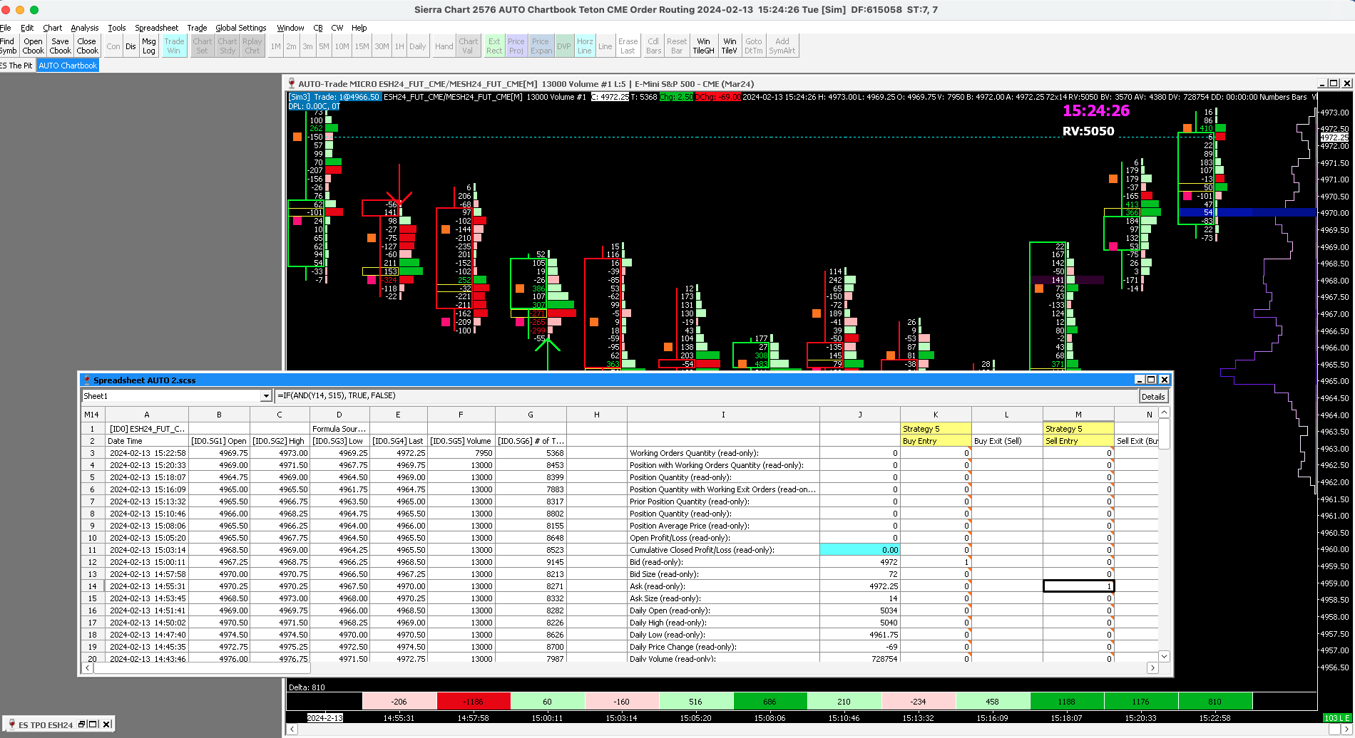 Hi support: I have a Spreadsheet System for Trading running. At the close of the candle at 14:55:31 I got a sell signal as shown on my spreadsheet. No order was placed. I replayed the chart several times and I never saw an order go on. (I do have limit orders set to expire after 2000 volume has traded in the current bar but no trade was placed). Attached is the Trade Activity Log and a screenshot of the spreadsheet and chart. What am I doing wrong? Many thanks for your help. |