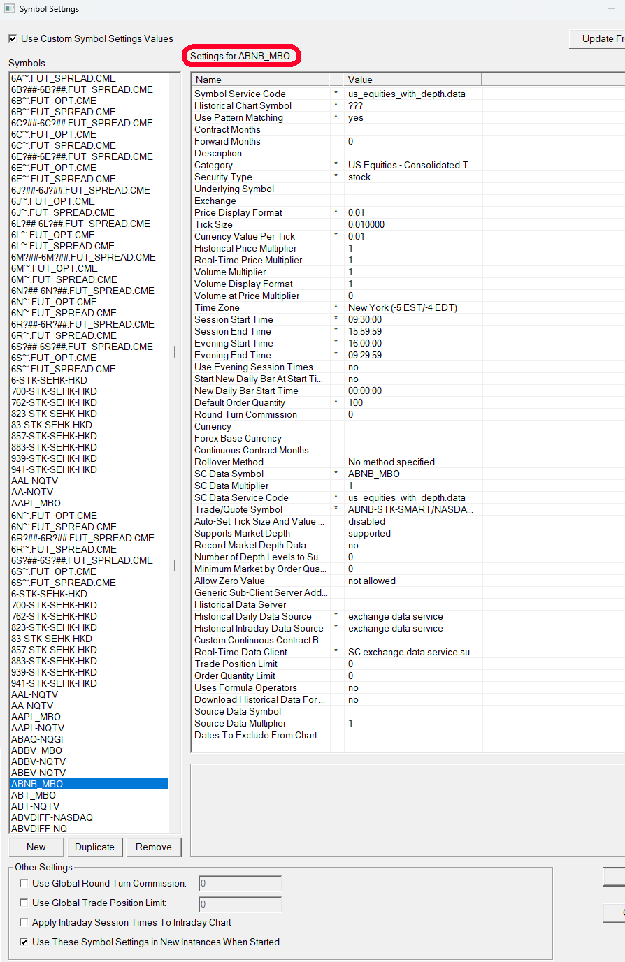 I needed to create individual symbol settings for stocks like IBM_MBO and ABNB_MBO. In order to place orders on them, they need to be used in conjuction with their full IBKR format : ABNB-STK-SMART/NASDAQ-USD as "trade/quote symbol". Their primary exchange has to be specified, otherwise there'll be a confusion on IBKR's side. Following IBKR's recent change to its symbols, I applied the same process to more symbols, in order to avoid any confusion from IBKR. With these individual symbol settings, the "date range in file" stopped on 2024/03/20 for historical charts. This means yesterday's bars aren't loaded (yesterday was 2024/03/21). Yesterday doesn't exist in the notepad from Edit >> Edit Data - Historical Chart. The last day to be mentionned in the notepad is 2024/03/20 Intraday charts do load the newer data properly. Only historical charts are affected. Stocks for which I do not have a customized, unique, individual symbol setting load yesterday's historical daily bar correctly. These symbols use the general and unspecified ???_MBO settings. "Download data for all historical charts" doesn't solve anything. Neither does "Delete all data and download". Going to the historical chart's settings, I can confirm the date range in file (read only) is 2024-03-20. My load data limiting method was already "use number of days to load". Switching to "use date range" obviously doesn't help. The issue must come from Symbol settings. It's only been happening since I made this change to them. I have attached 2 screenshots that allow comparison between an individual custom symbol setting like ABNB_MBO and the default, unspecified ????_MBO. Both are nearly identical, so I don't understand where lies the precise issue. Editing the second line, Historical Chart Symbol, from ???? to ABNB didn't help. As you can see in the last screenshot, yesterday's bar is missing. Date Time Of Last Edit: 2024-03-22 23:06:55