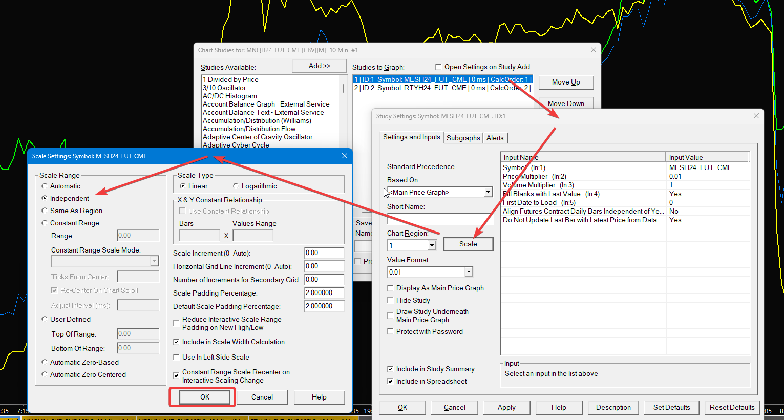 Due to a mistake yesterday I accidentally deleted all my charts. I've been rebuilding my charts and there is one I can't duplicate. I had a line chart of MES with NQ and RTY overlaid for comparison. The Add Additional Symbol study won't allow me to place the symbols on the same chart area and Study/Price Overlay places the symbols at their respective levels and the chart is unreadable. I have the scale set to independent and use left side but that doesn't help. What do I have to do to correct this. PS: It did work on the older charts I was using.