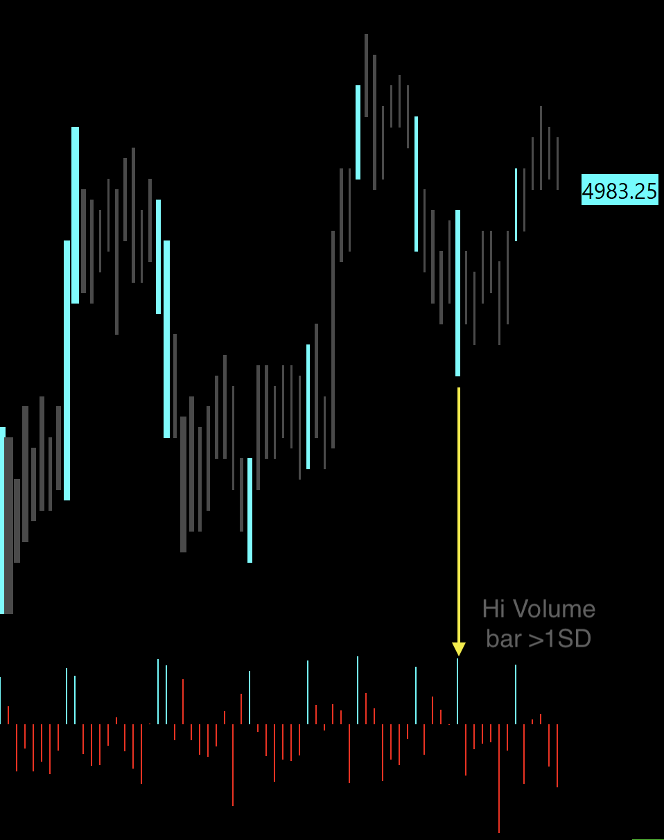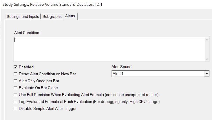 For this, enter the following formula in the alerts tab of the "Relative Volume Standard Deviation" study: =SG1 > 1.0 Refer to the following regarding setting up alerts: Study/Chart Alerts And Scanning And refer to the following for how to setup the alert sound: General Settings Window: Configuring Alert Number Instructions Note that if you put the alert on a different study, then you would need to reference the "Relative Volume Standard Deviation" study by changing the formula to the following: =ID1.SG1 > 1.0 Where ID1 is the ID of the "Relative Volume Standard Deviation" study. For the most reliable, advanced, and zero cost futures order routing, use the Teton service: Sierra Chart Teton Futures Order Routing |