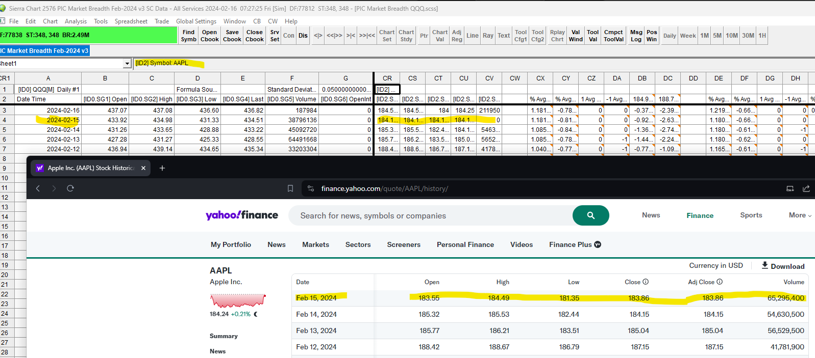 Hello Sierra Chart team, I have been using spreadsheets for a while and the following issue occurred to me this week and I can't fix it. I have a chart of QQQ with the Add Additional Symbol studies for all the symbols in the QQQ, the I use a spreadsheet study to calculate simple math calculations, for the past few days ONLY row 4 for all 101 additional symbols show a random OHLC price and volume Zero. I have tried to use all download historical data, delete download historical data, reload historical data and reload and recalculate historical data in the Edit menu of the chart but random values remain the same. Thank you for your feedback. |